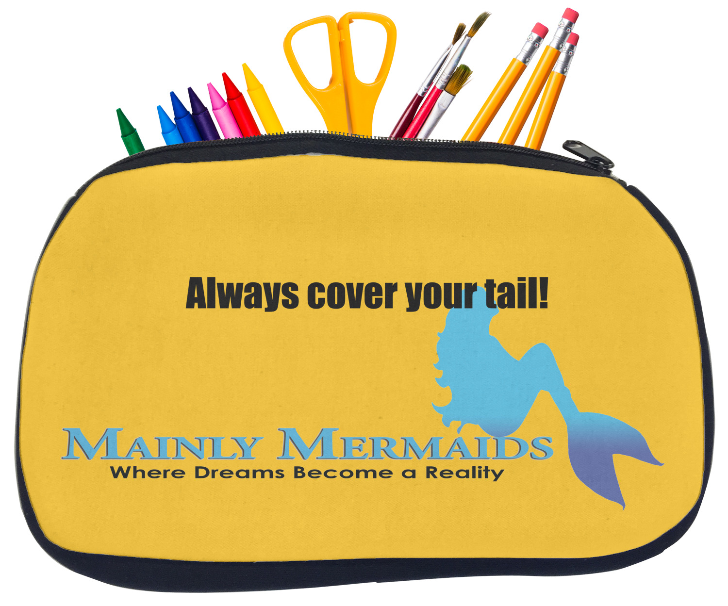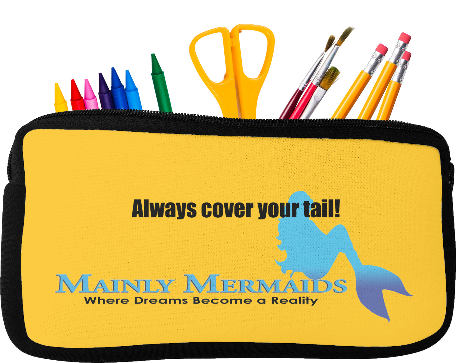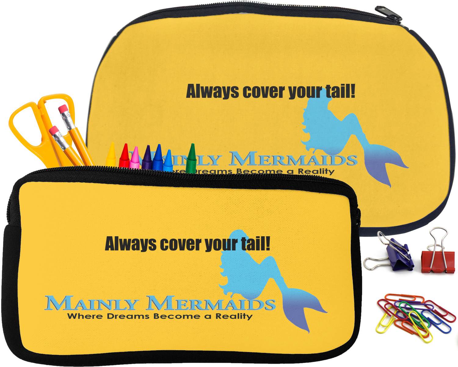 Built from durable neoprene, these pencil pouches, are water resistant, and prevent leaking ink from spilling into your backpack or purse. These custom pencil cases secure with a robust, black zipper. We print your personalized design on the front of this pouch, while the remaining sides a simple black color. These colored pencil cases [880] are sold in two sizes; our smaller version measures at 8.5 by 4.5 inches, while the medium measures at 10.5 by 6.5 inches. The smaller size is more suitable for holding pencils and pens, while our medium size can accommodate pencil sharpeners, scissors, and erasers.