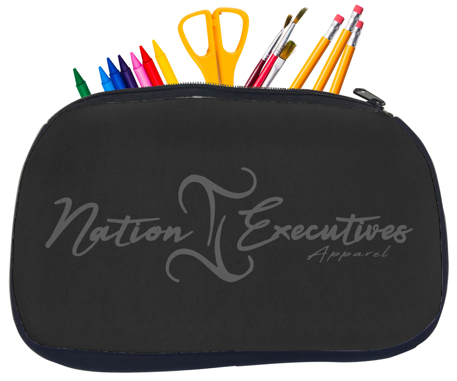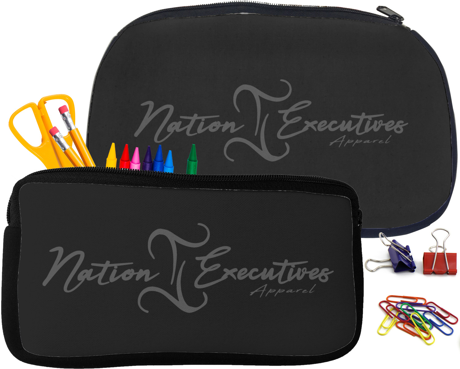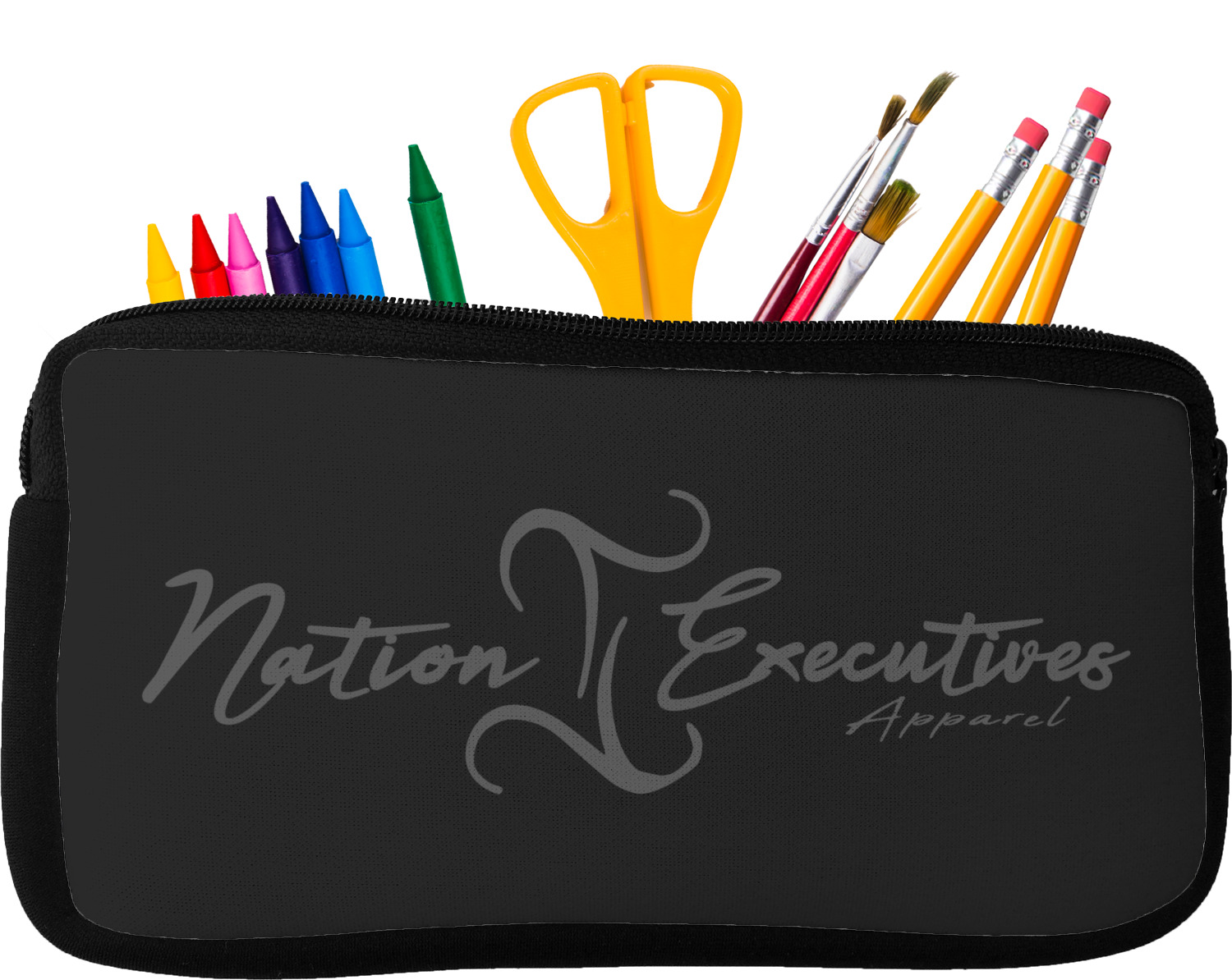 Built from durable neoprene, these pencil pouches, are water resistant, and prevent leaking ink from spilling into your backpack or purse. These custom pencil cases secure with a robust, black zipper. We print your personalized design on the front of this pouch, while the remaining sides a simple black color. These colored pencil cases [880] are sold in two sizes; our smaller version measures at 8.5 by 4.5 inches, while the medium measures at 10.5 by 6.5 inches. The smaller size is more suitable for holding pencils and pens, while our medium size can accommodate pencil sharpeners, scissors, and erasers.