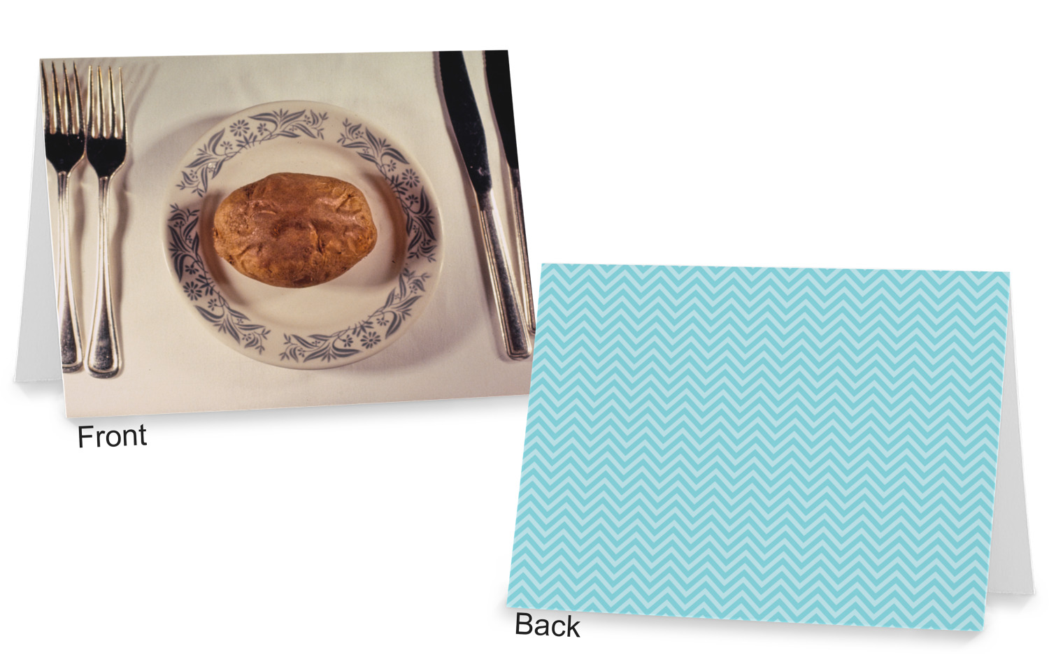 Our custom folded note cards are printed on premium 100lb. card stock and comes with white envelopes. The note card measure 5.5 by 4.25 inches and are blank on the inside for your handwritten message.