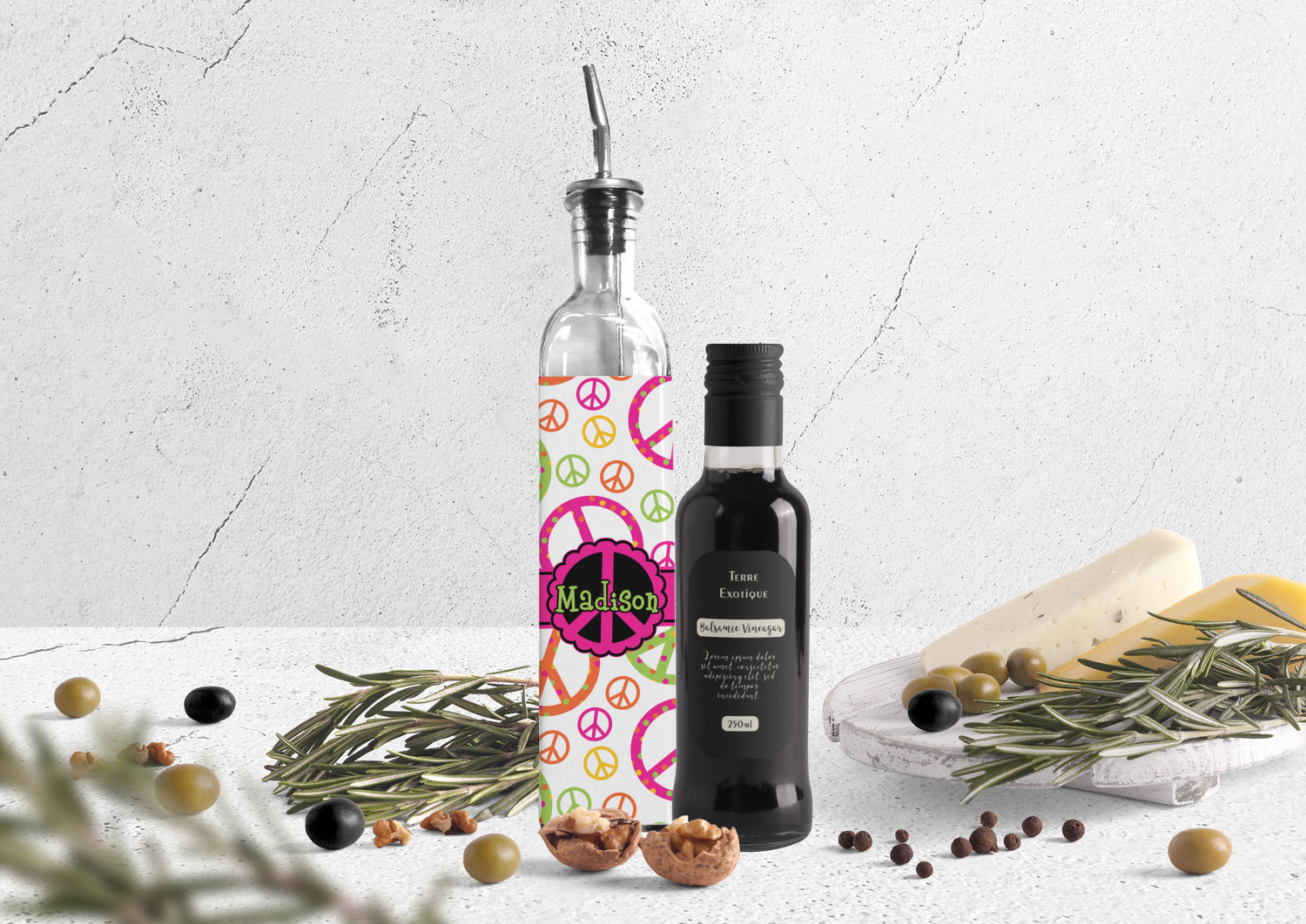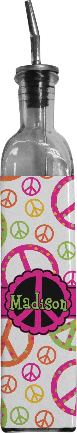 Made from recycled glass in Spain, these oil bottles have a classic, delicate look, and are accompanied by a metal spout for controlled pouring. Each bottle holds approximately 13 ounces and measures at 12 by 2 inches. We customize your glass oil bottle by applying your personalized design on the front and sides, using an adhesive. Our customizable stickers are made from high quality, gloss vinyl and are printed with waterproof, eco-solvent inks. These pieces are machine cut for accuracy and symmetry. The result is a robust, waterproof, adhesive decal that will not fade or deteriorate with time.