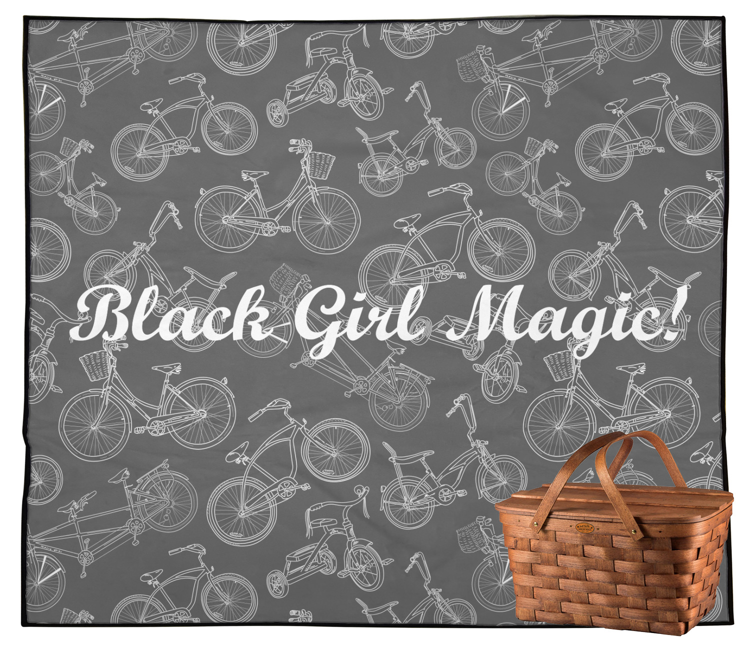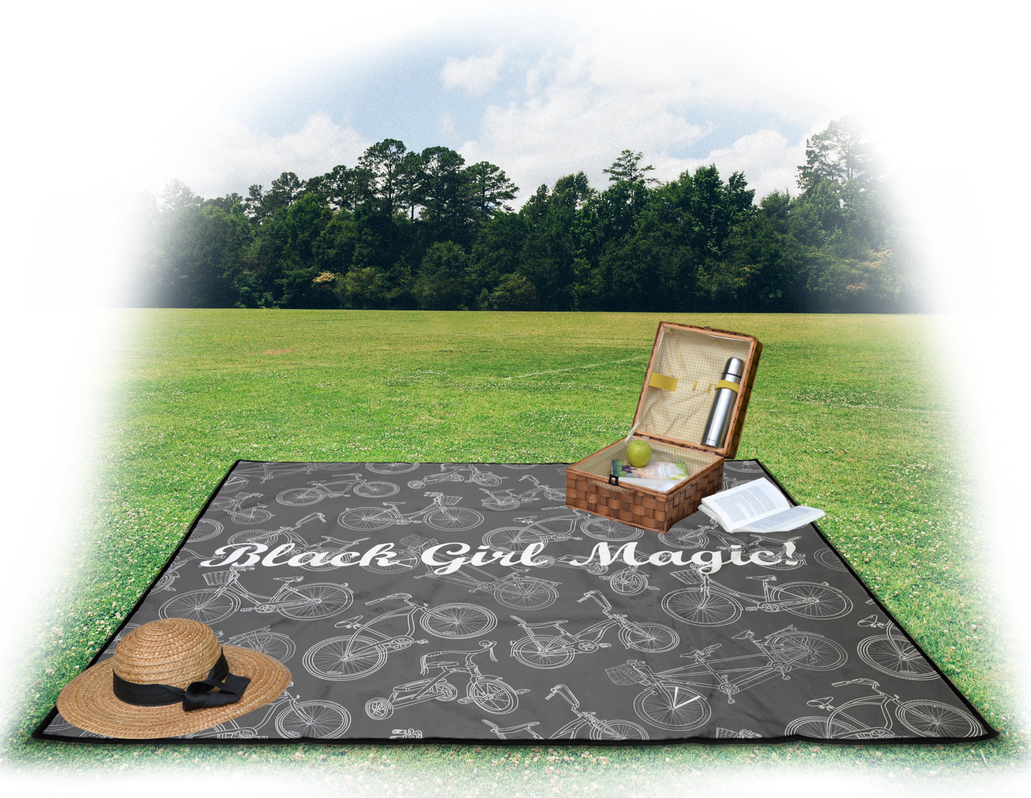 This picnic blanket is perfect for hanging out with your friends at the park or anywhere outside. The top of the blanket is made of a super soft microfiber fleece. The bottom of the blanket is made of a black material similar to a rain jacket and is water repellent as well. This will keep any wet spots on the ground from soaking through your picnic blanket. No one likes a wet blanket. The blanket measures at approximately 50" x 59" and has a nicely finished ribbon edge.
