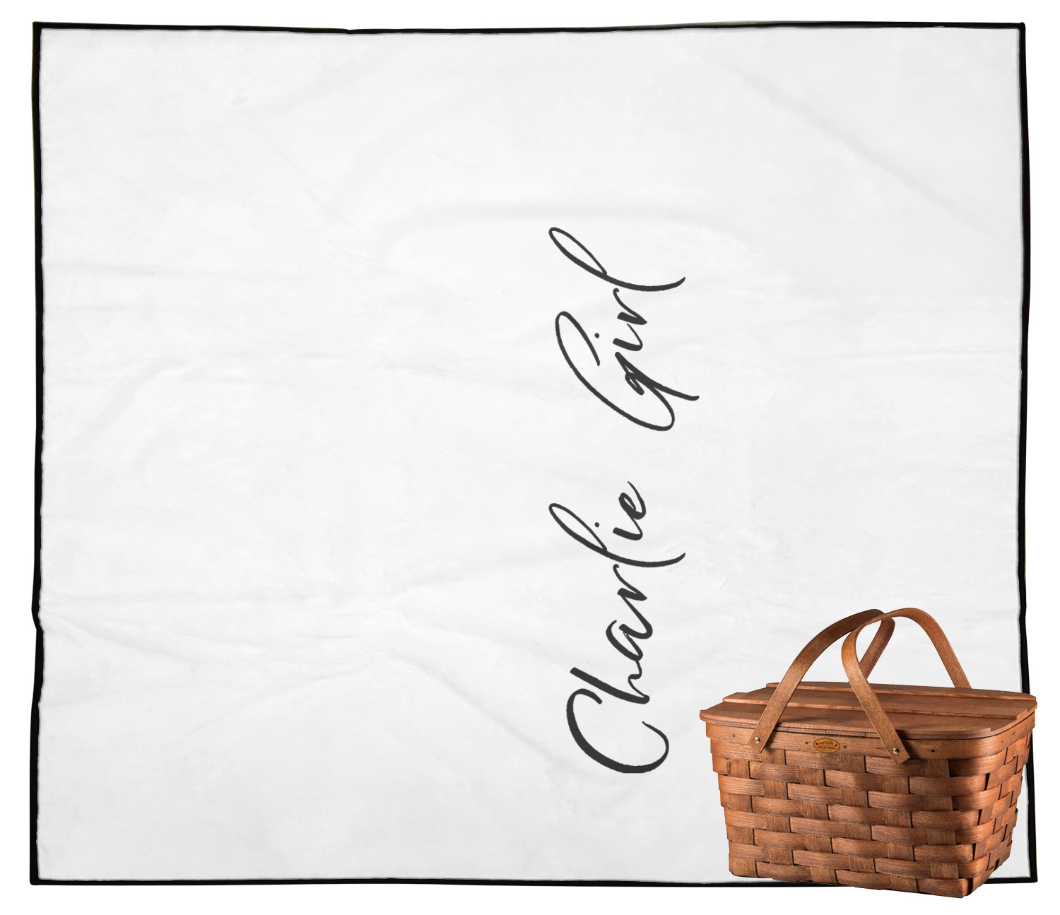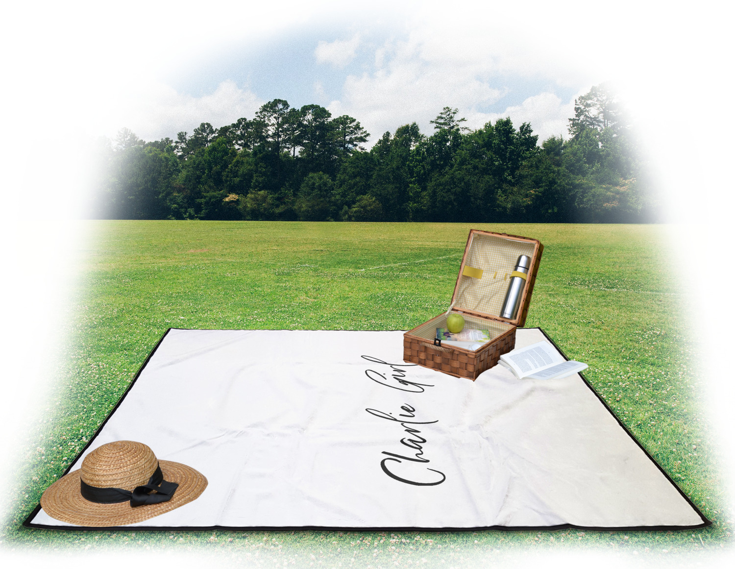 This picnic blanket is perfect for hanging out with your friends at the park or anywhere outside. The top of the blanket is made of a super soft microfiber fleece. The bottom of the blanket is made of a black material similar to a rain jacket and is water repellent as well. This will keep any wet spots on the ground from soaking through your picnic blanket. No one likes a wet blanket. The blanket measures at approximately 50" x 59" and has a nicely finished ribbon edge.