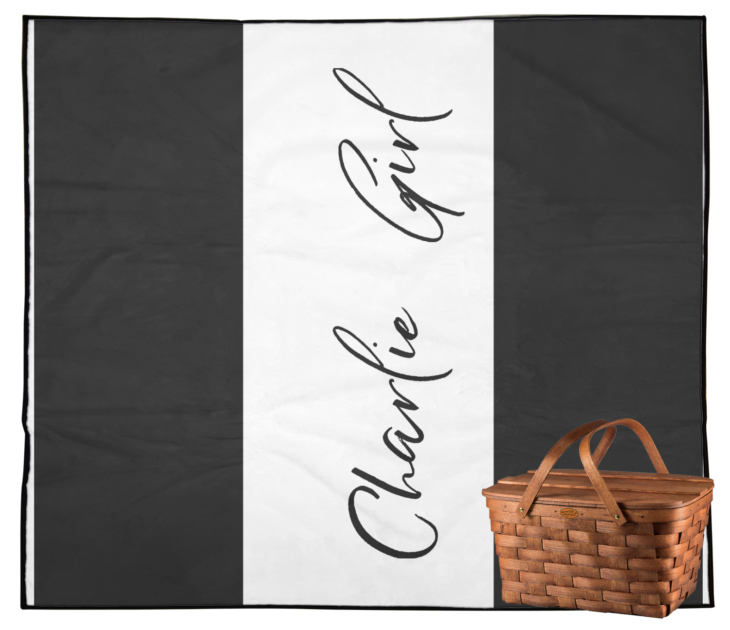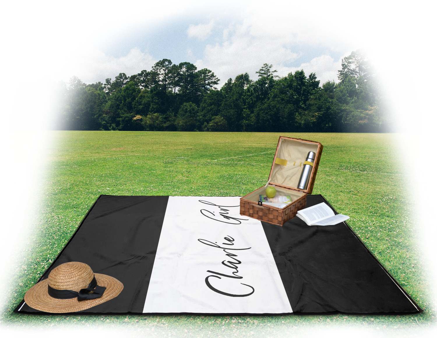 This picnic blanket is perfect for hanging out with your friends at the park or anywhere outside. The top of the blanket is made of a super soft microfiber fleece. The bottom of the blanket is made of a black material similar to a rain jacket and is water repellent as well. This will keep any wet spots on the ground from soaking through your picnic blanket. No one likes a wet blanket. The blanket measures at approximately 50" x 59" and has a nicely finished ribbon edge.