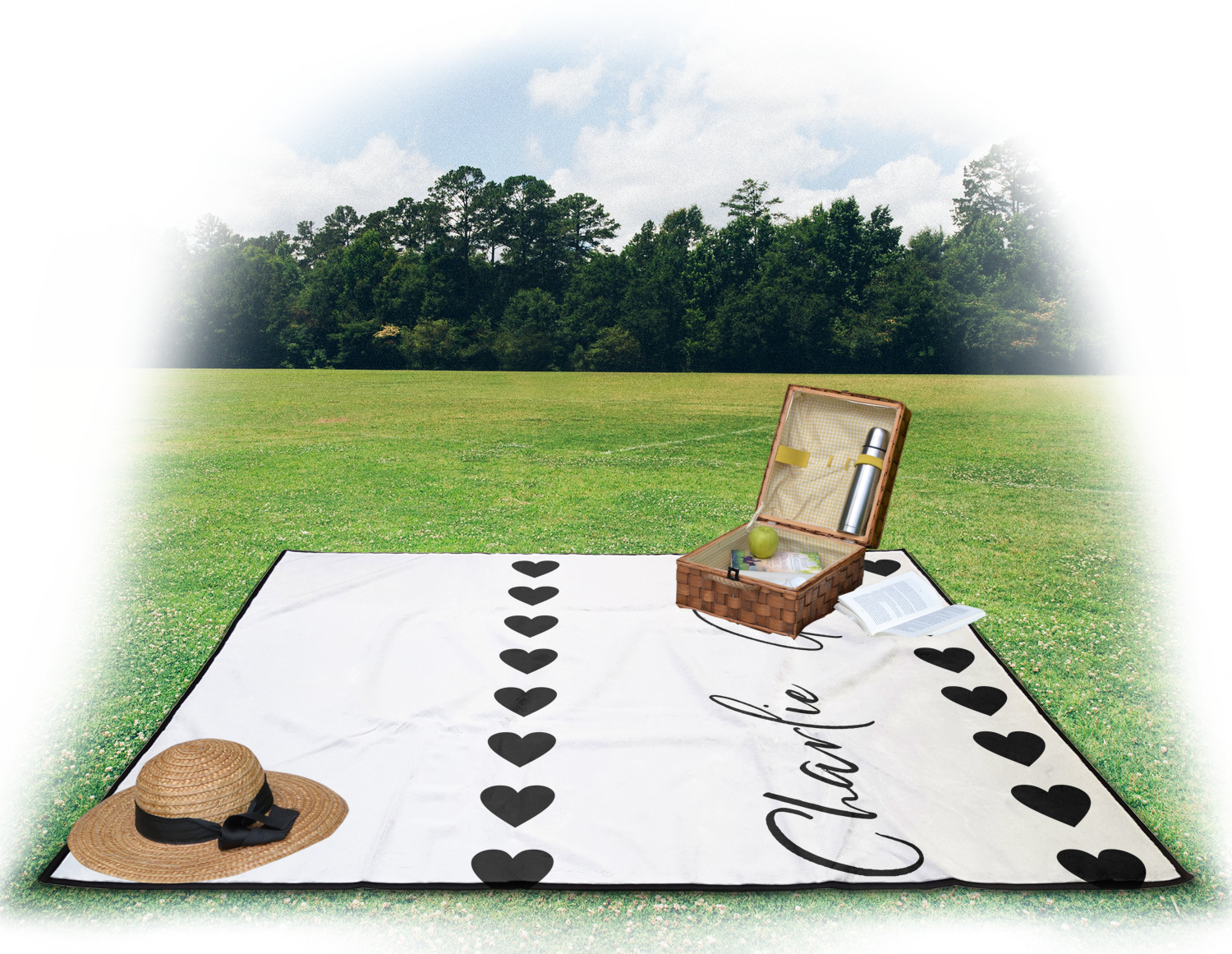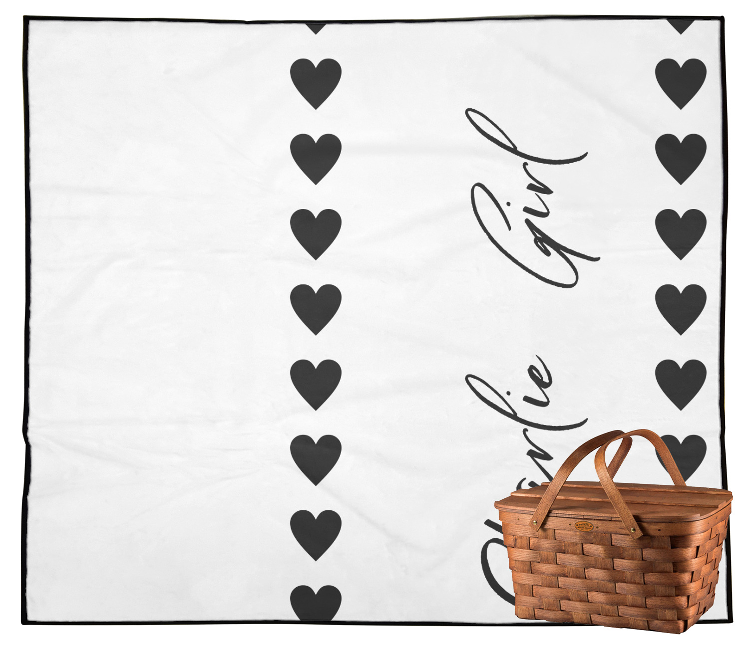 This picnic blanket is perfect for hanging out with your friends at the park or anywhere outside. The top of the blanket is made of a super soft microfiber fleece. The bottom of the blanket is made of a black material similar to a rain jacket and is water repellent as well. This will keep any wet spots on the ground from soaking through your picnic blanket. No one likes a wet blanket. The blanket measures at approximately 50" x 59" and has a nicely finished ribbon edge.