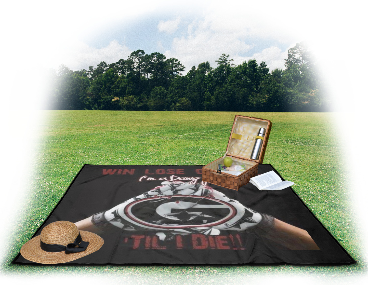 This picnic blanket is perfect for hanging out with your friends at the park or anywhere outside. The top of the blanket is made of a super soft microfiber fleece. The bottom of the blanket is made of a black material similar to a rain jacket and is water repellent as well. This will keep any wet spots on the ground from soaking through your picnic blanket. No one likes a wet blanket. The blanket measures at approximately 50" x 59" and has a nicely finished ribbon edge.