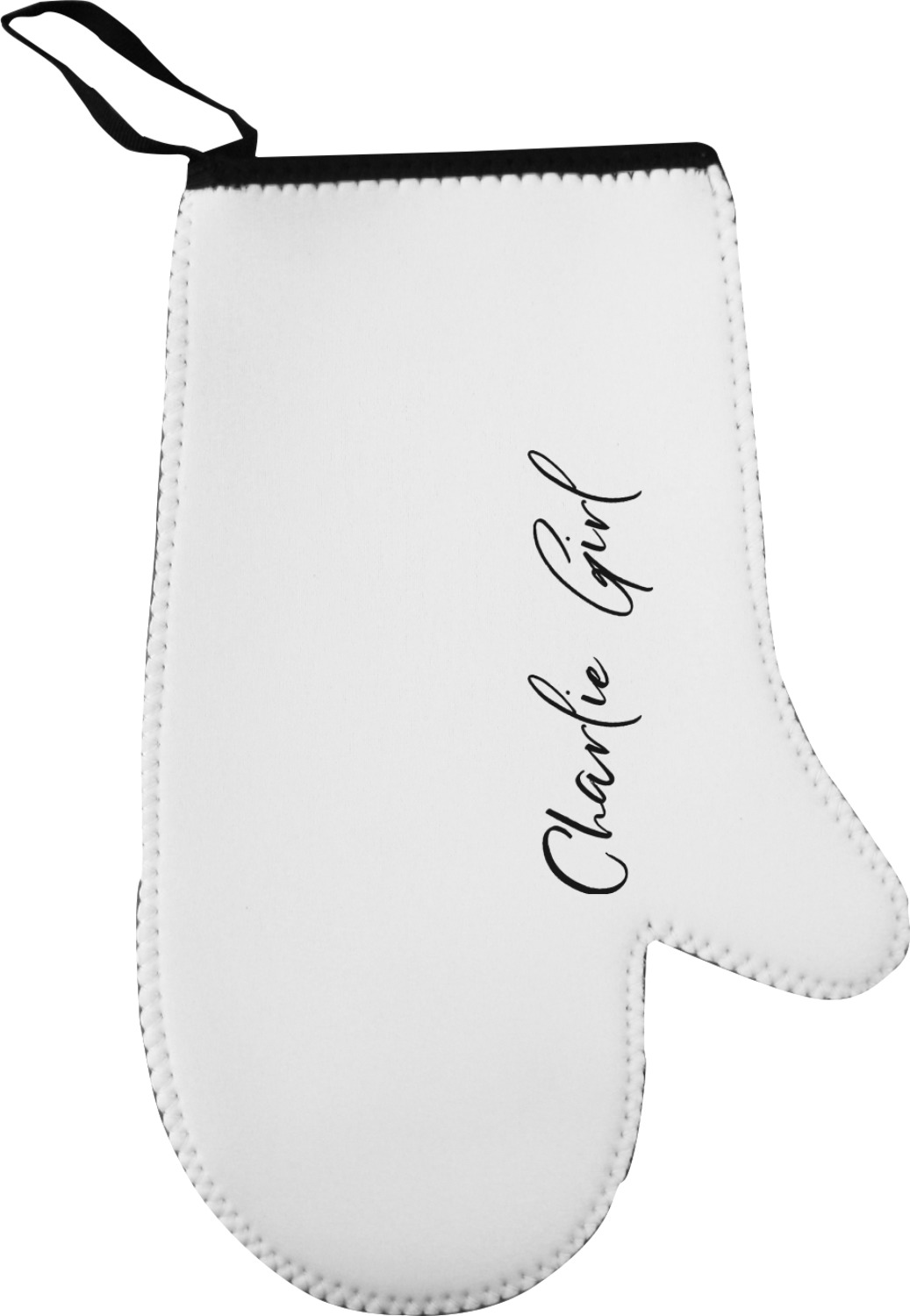 Our oven gloves are made from a durable neoprene and feature a textured, rubberized surface on the palms side for a better grip. A strong stitch joins the neoprene and rubber, increasing the durability of this mitt. These kitchen mittens are spacious and can accommodate both small and large hands. A thin, black loop is attached to the mitts top, which can be used to display and store the mitt. Your customization is displayed across the entire front of the neoprene surface, or the top of the glove. We sell both left and right models of these, separately.