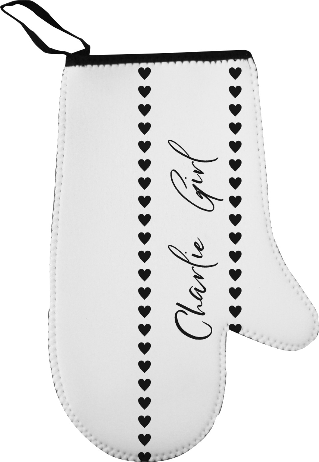 Our oven gloves are made from a durable neoprene and feature a textured, rubberized surface on the palms side for a better grip. A strong stitch joins the neoprene and rubber, increasing the durability of this mitt. These kitchen mittens are spacious and can accommodate both small and large hands. A thin, black loop is attached to the mitts top, which can be used to display and store the mitt. Your customization is displayed across the entire front of the neoprene surface, or the top of the glove. We sell both left and right models of these, separately.