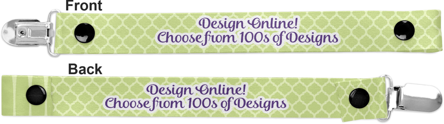 This personalized pacifier clip is the ideal size and measures at approximately 7.5 inches in length, when either end is snapped closed. On one end, you'll find a snap button. This button of your baby's pacifier holder is what can be attached to their pacifier to hold is securely in place. Simply open the snap, slip it through the pacifier opening, and snap it back into place. On the opposite end of this baby pacifier holder, you'll find a metal clip that can secure to a baby's collar or sleeve. This clip ensures that the strap stays in place, and that your baby's pacifier is always on hand.
