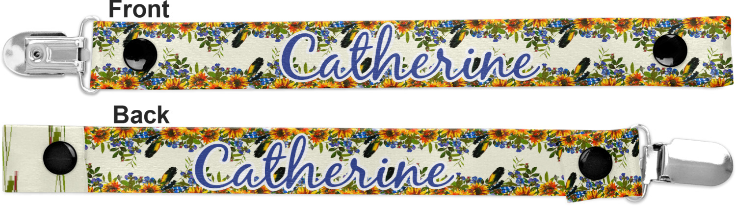 This personalized pacifier clip is the ideal size and measures at approximately 7.5 inches in length, when either end is snapped closed. On one end, you'll find a snap button. This button of your baby's pacifier holder is what can be attached to their pacifier to hold is securely in place. Simply open the snap, slip it through the pacifier opening, and snap it back into place. On the opposite end of this baby pacifier holder, you'll find a metal clip that can secure to a baby's collar or sleeve. This clip ensures that the strap stays in place, and that your baby's pacifier is always on hand.