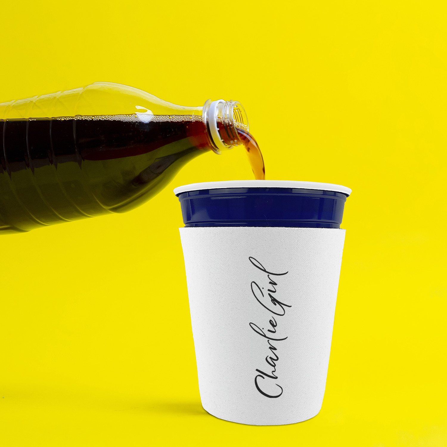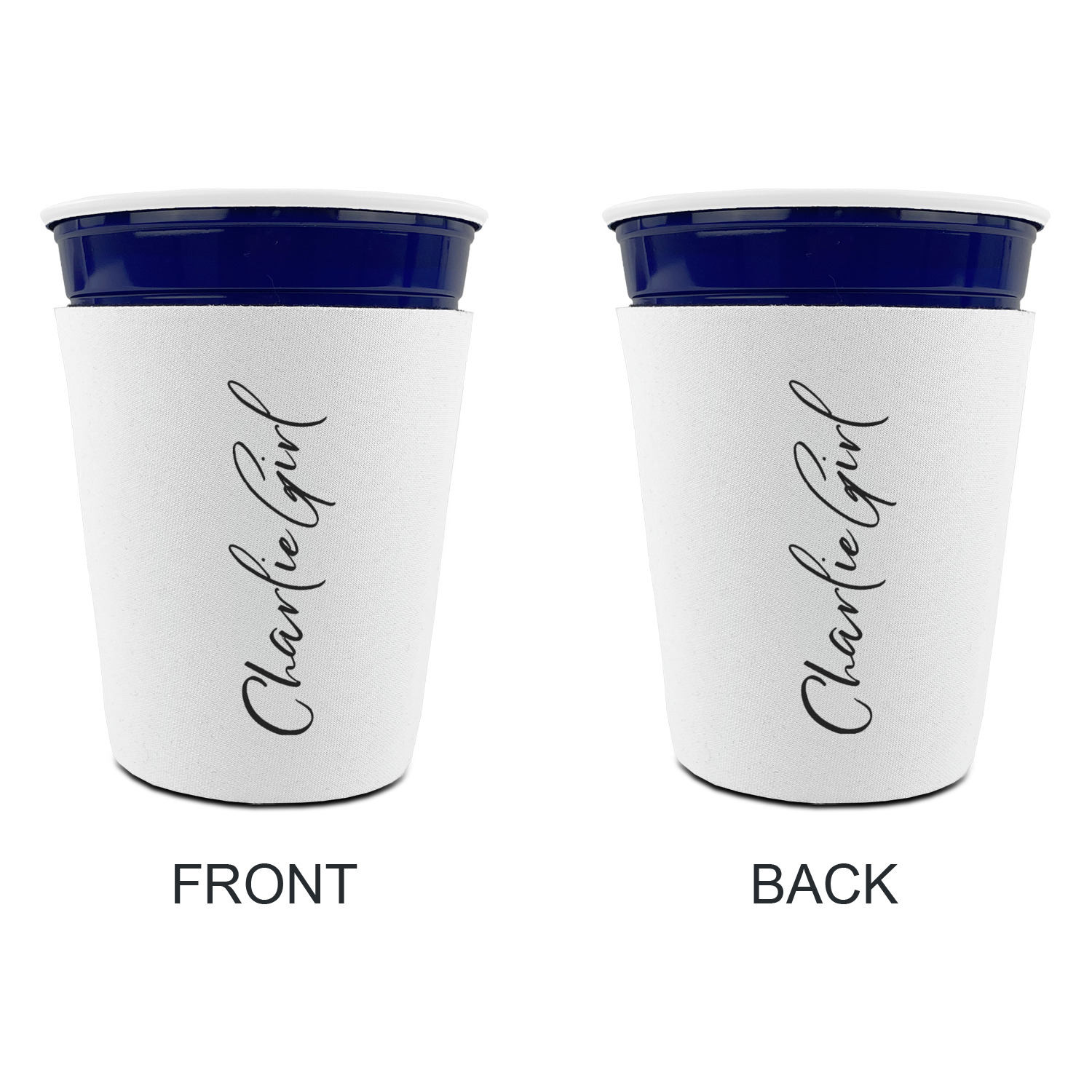 Made from neoprene with a polyester outer fabric and sewn seams, these premium quality party cup sleeves are very durable and will hold up to heavy use. They are available in 2 styles - with a bottom or just a sleeve to go around the outside of the tapered cup. The sleeve covers are about 4" tall and cover about 90% of the classic 16 oz. Solo cup.