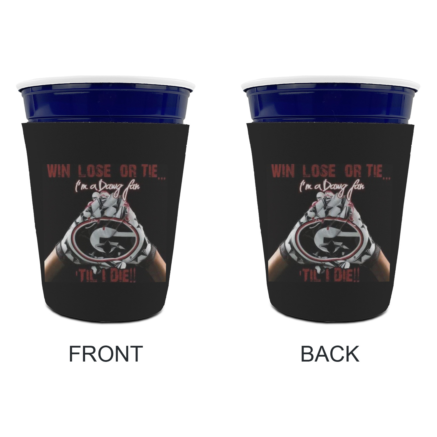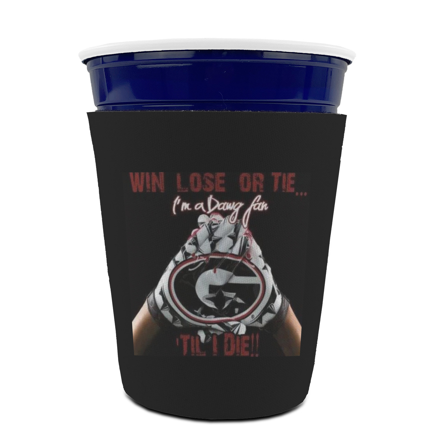 Made from neoprene with a polyester outer fabric and sewn seams, these premium quality party cup sleeves are very durable and will hold up to heavy use. They are available in 2 styles - with a bottom or just a sleeve to go around the outside of the tapered cup. The sleeve covers are about 4" tall and cover about 90% of the classic 16 oz. Solo cup.