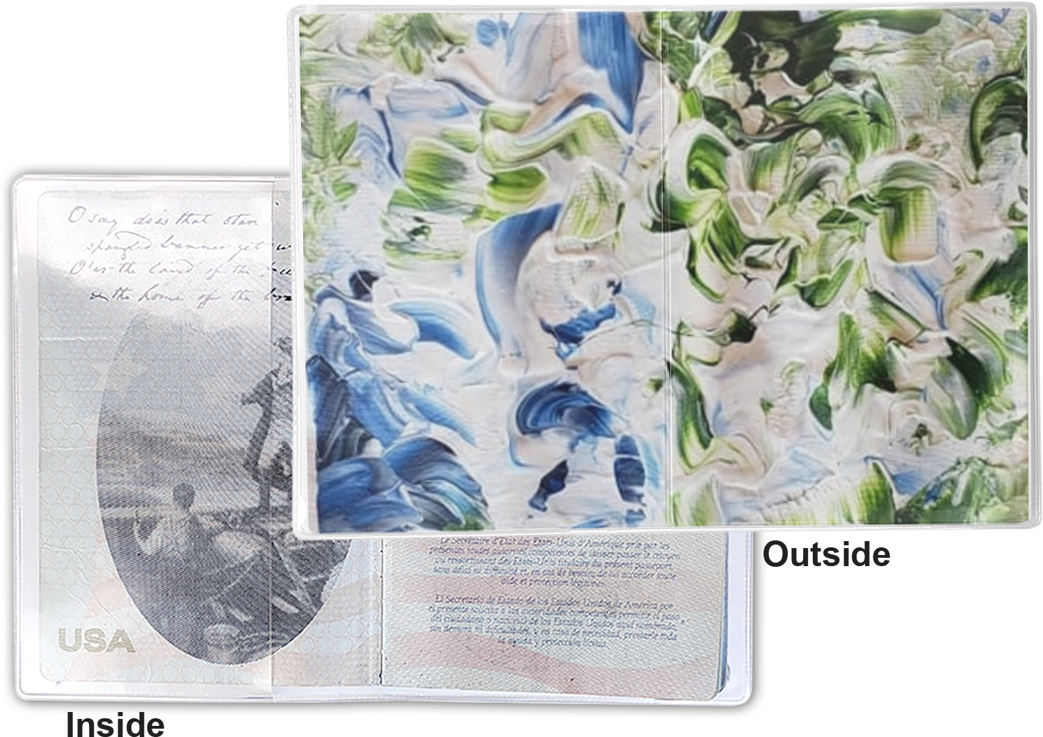 This cover is made of a sturdy clear vinyl with a personalized vinyl insert inside. There is a large and a small pocket on either side to hold the covers of your passport easily and firmly. The passport holder is approximately 7.5" x 5.25", the perfect size to snugly fit your passport. This slim cover is the perfect way to protect your passport without being one more bulky item you have to carry.