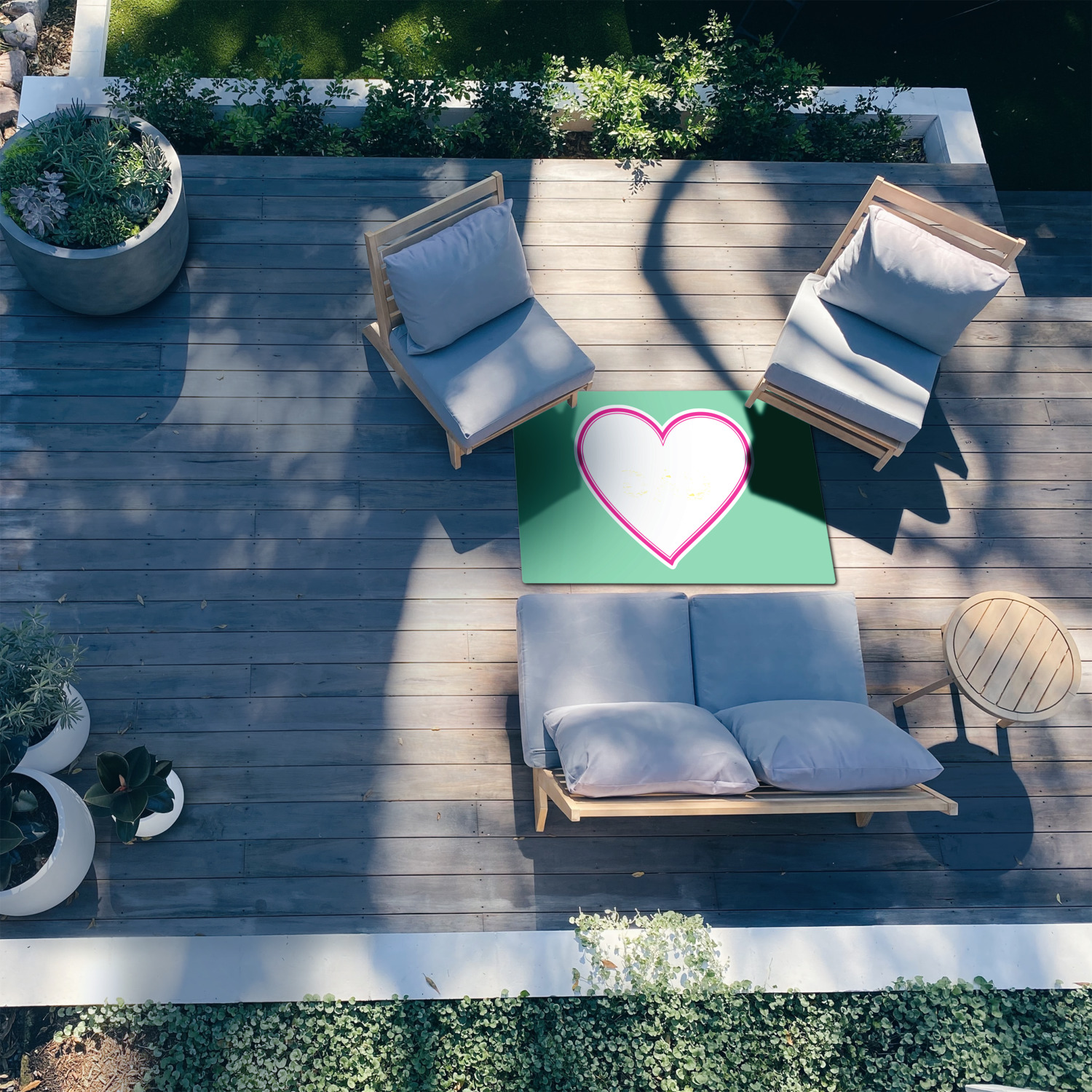 Our custom patio area rugs are velvety soft and smooth, with a short pile, beautiful sewn corners and edges for a refined and exquisite finished look. The poly chenille face is printed with your design and is sure to brighten up any room with its fabulous look. They have just enough cushion to feel comfortable under foot but not soak up water in the weather and offer a quick drying material.
