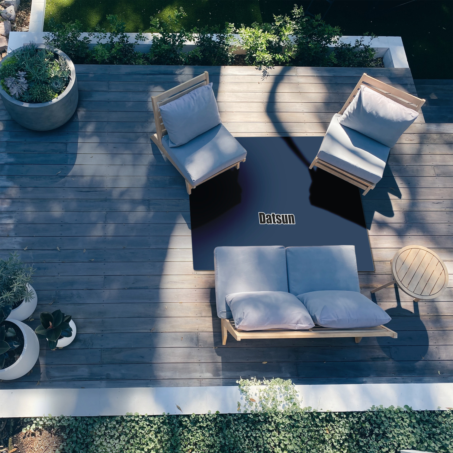 Our custom patio area rugs are velvety soft and smooth, with a short pile, beautiful sewn corners and edges for a refined and exquisite finished look. The poly chenille face is printed with your design and is sure to brighten up any room with its fabulous look. They have just enough cushion to feel comfortable under foot but not soak up water in the weather and offer a quick drying material.