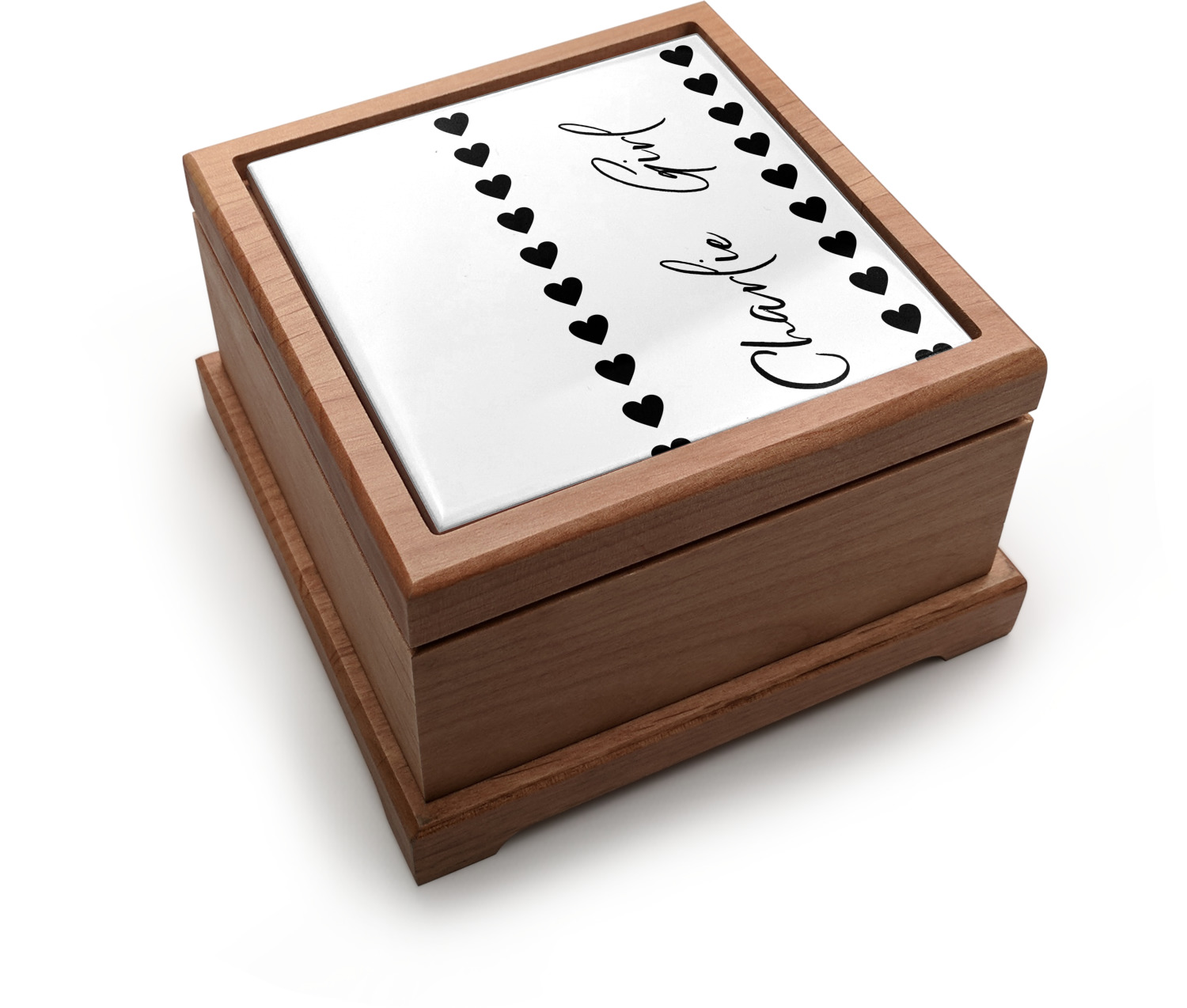 Our beautiful pet urns, shaped as decorative square boxes, are built from fine, red alder wood. The urn's bottom unscrews easily, with a screwdriver, allowing you to safely place your pet's ashes inside. The inner dimensions of the urn measure at 3.5" long, 3.5" wide, and 2" deep. The external base of the urn measures at 5.5" x 5.5", while its height is 3.5". We display your pet's picture, dates of living, or any other desired customization atop the ceramic tile that covers the top of the urn.