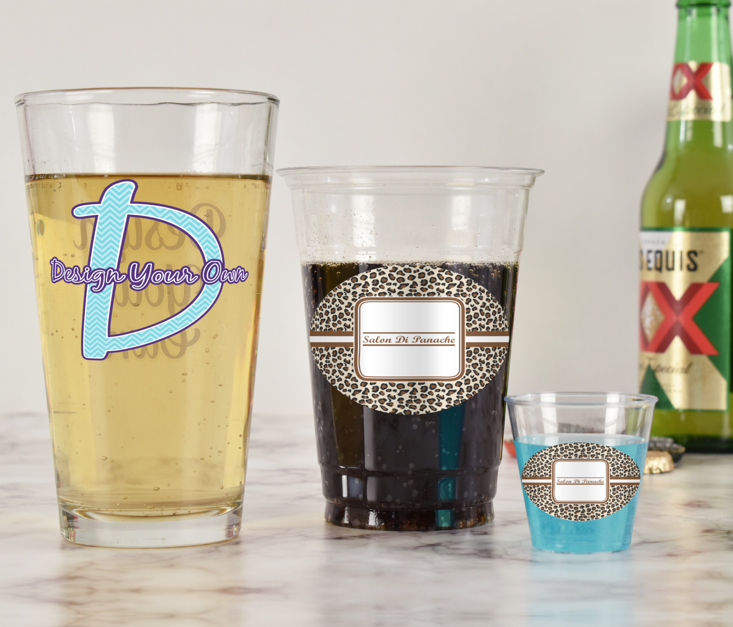 With these glasses you will get your choice of 2 content items on them. Perfect for company promotion or if you own a small restaurant or bar order these to perfectly match your business. Once designed we will print your design directly onto the glass and then a clear coat applied over it to ensure the print lasts for years to come.