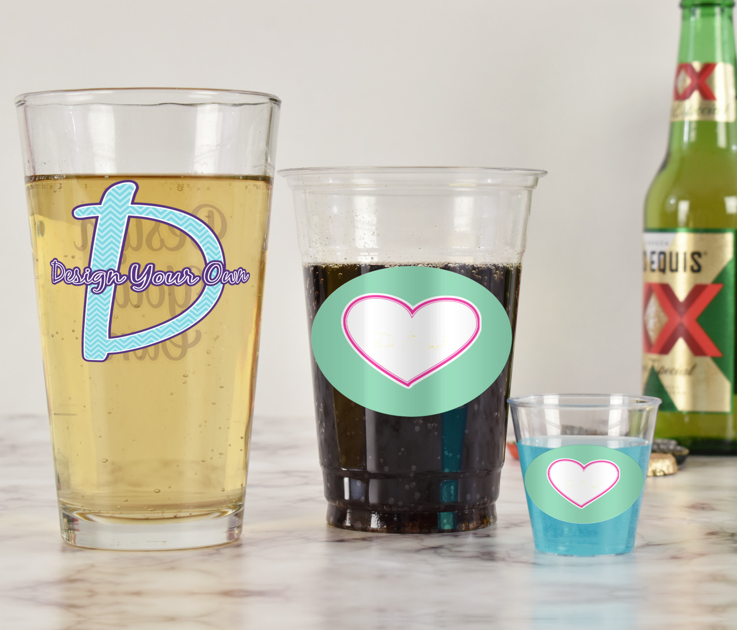 With these glasses you will get your choice of 2 content items on them. Perfect for company promotion or if you own a small restaurant or bar order these to perfectly match your business. Once designed we will print your design directly onto the glass and then a clear coat applied over it to ensure the print lasts for years to come.