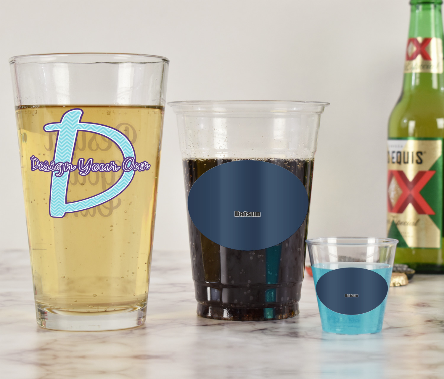 With these glasses you will get your choice of 2 content items on them. Perfect for company promotion or if you own a small restaurant or bar order these to perfectly match your business. Once designed we will print your design directly onto the glass and then a clear coat applied over it to ensure the print lasts for years to come.