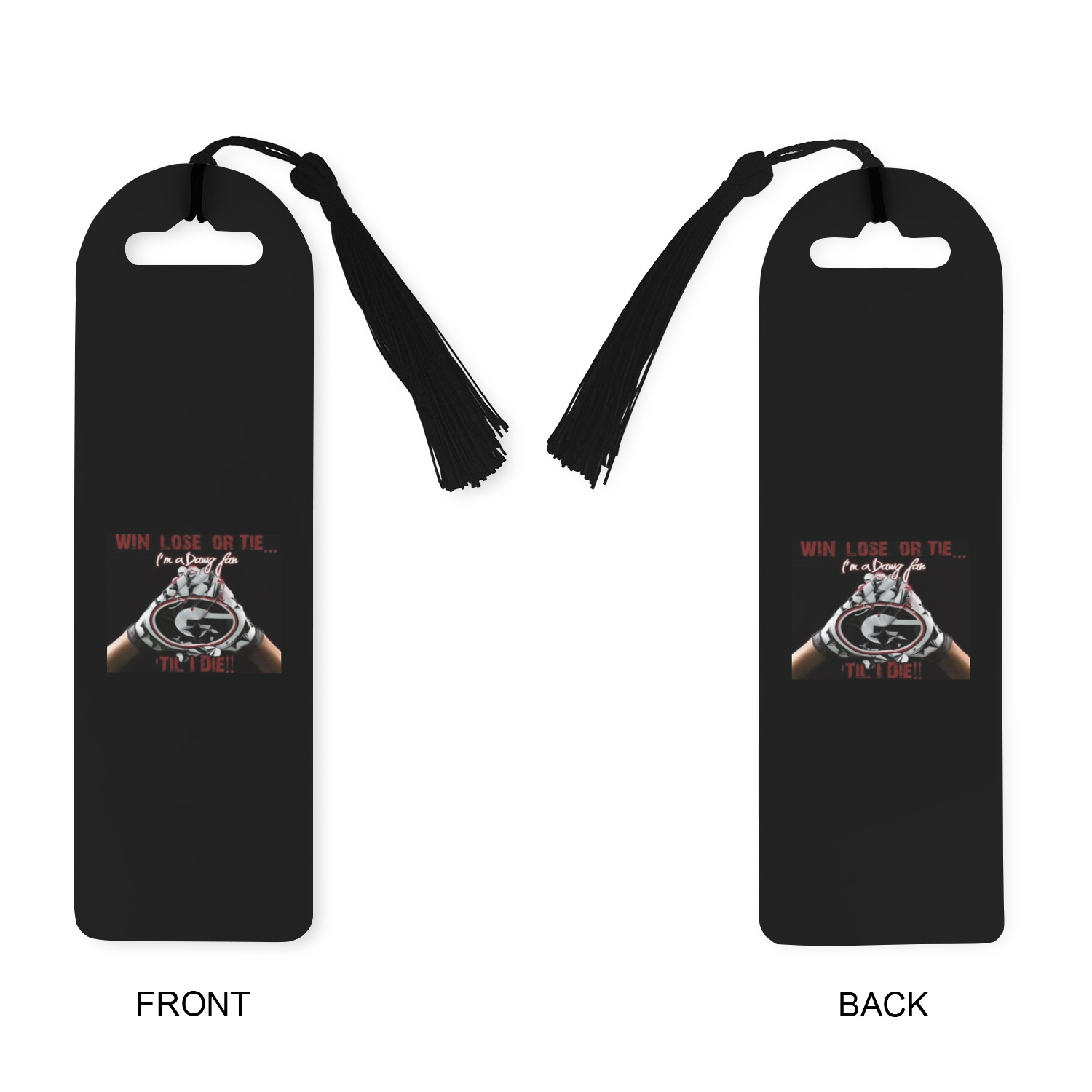 Made from a durable, flexible plastic, these bookmarks are printed with your custom design on them. With the tassel on them they make it easy to find your page in your book. These are a rectangular shape 7 1/4 inches tall with a rounded top and are approximately 2 1/4 inches wide.