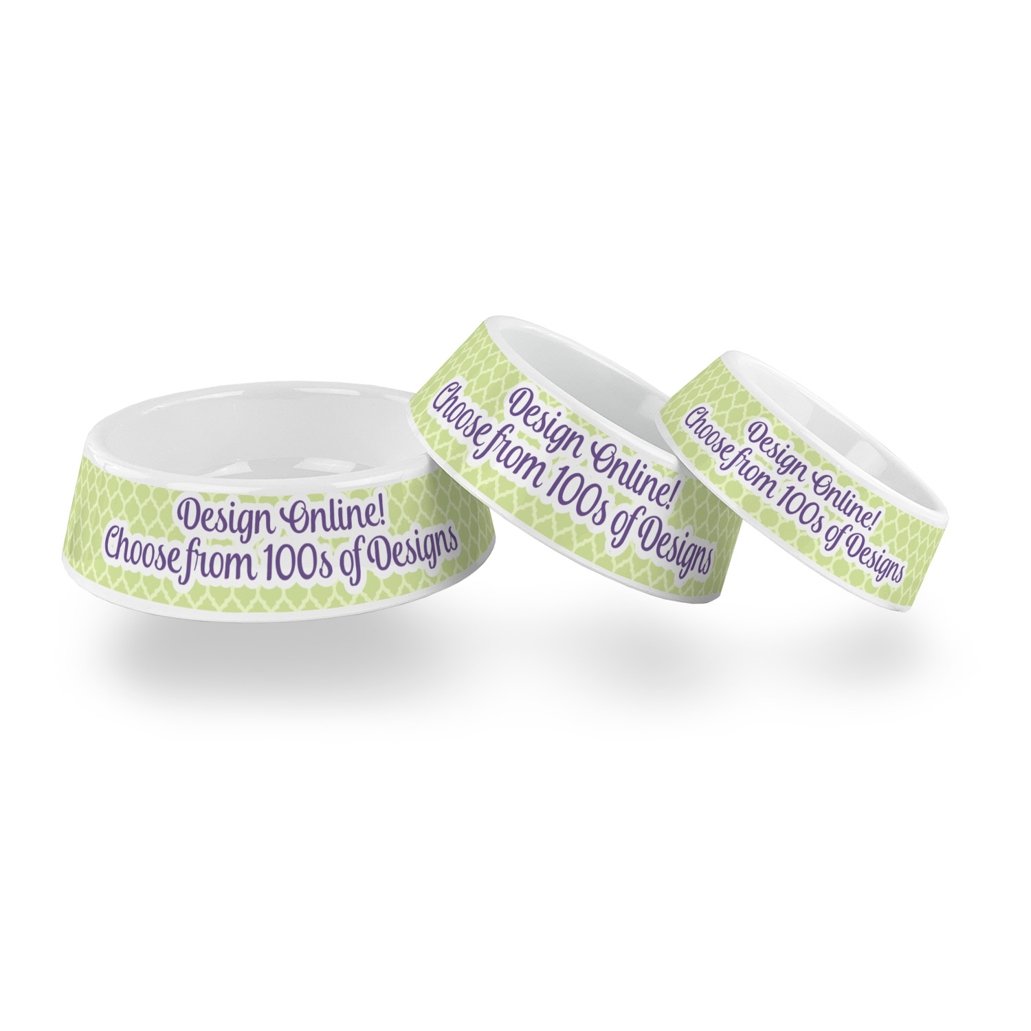 Made from a nearly indestructible composite polymer plastic these bowls come in 3 different sizes to suit any breed of dog. The small bowl measures approximately 5 in diameter and 1.75 tall and holds approximately 1.5 cups of food or water. The medium bowl measures approximately 6 in diameter and 2.25 tall and holds approximately 3 cups of food or water. The large bowl measures approximately 7.2 in diameter and 2.25 tall and holds approximately 4.5 cups of food or water. These bowls are microwave and dishwasher safe so no matter what type of food your dog eats it can be easily cleaned up for the next use. Design your own or use one of our 500 plus designs to make these pet bowls uniquely yours.