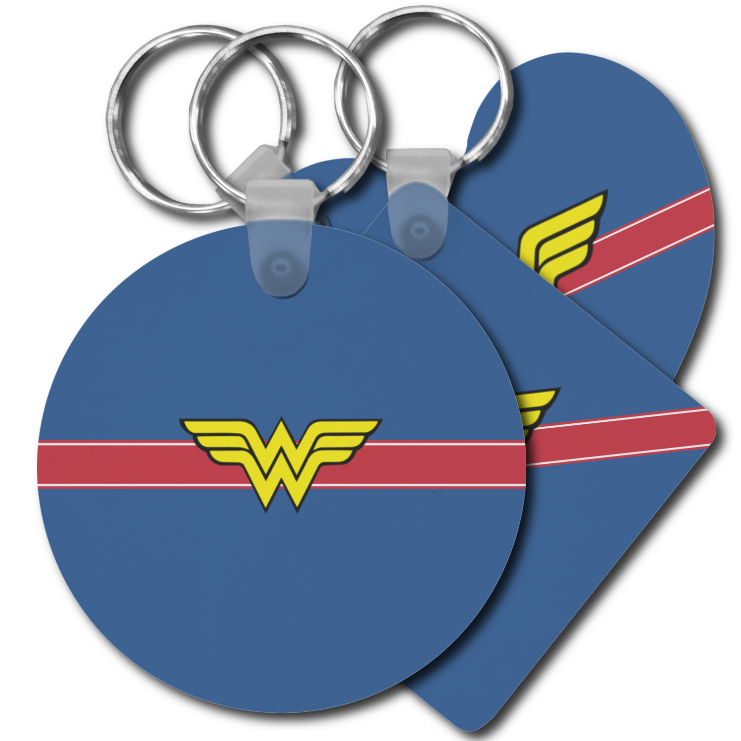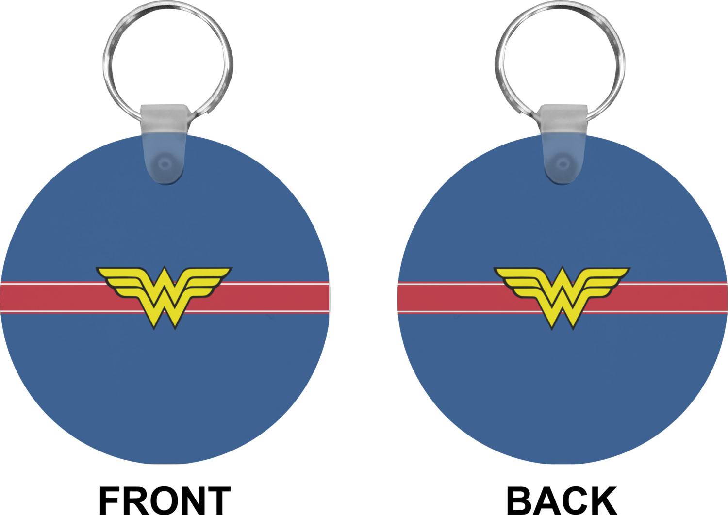 Our personalized keychains attach to the included metal, split key ring with a plastic, removable snap. Since a metal ring is included with your purchase, you have the liberty to keep your keys together on the ring, with or without your unique keychain. We offer this keychain in three different shapes: circle, heart, or diamond. We print your personalized design(s) on both sides of the key chain, and the surface has a glossy, reflective finish that only emphasizes your design. Each keychain is approximately 2.25 by 2.25 inches.
