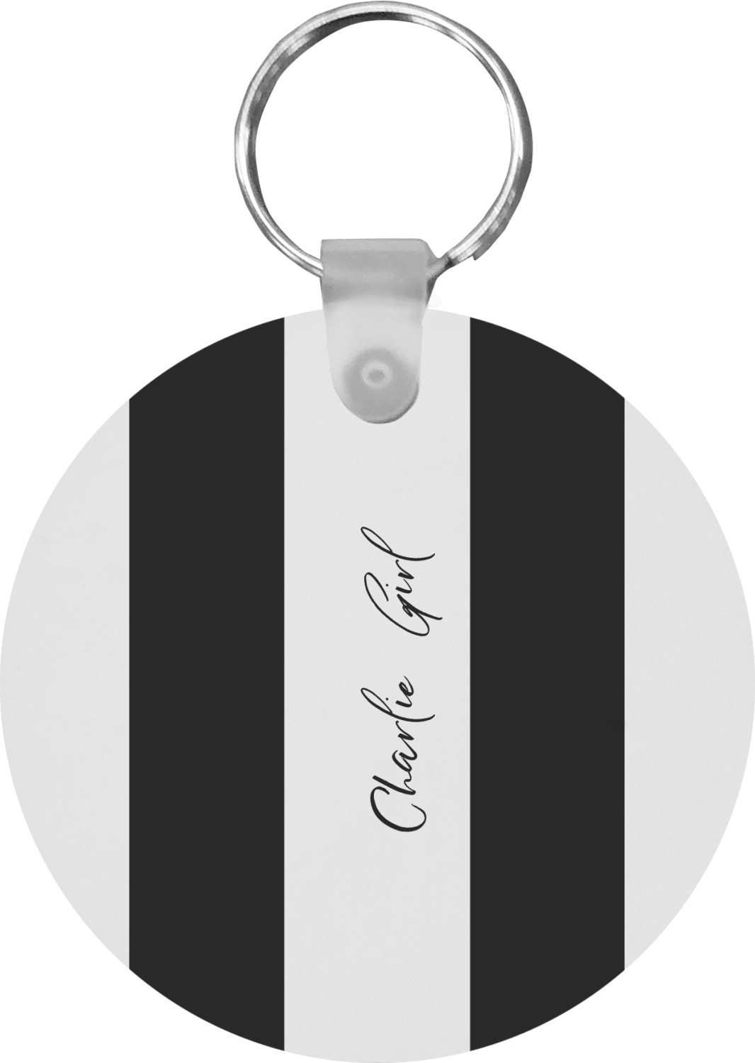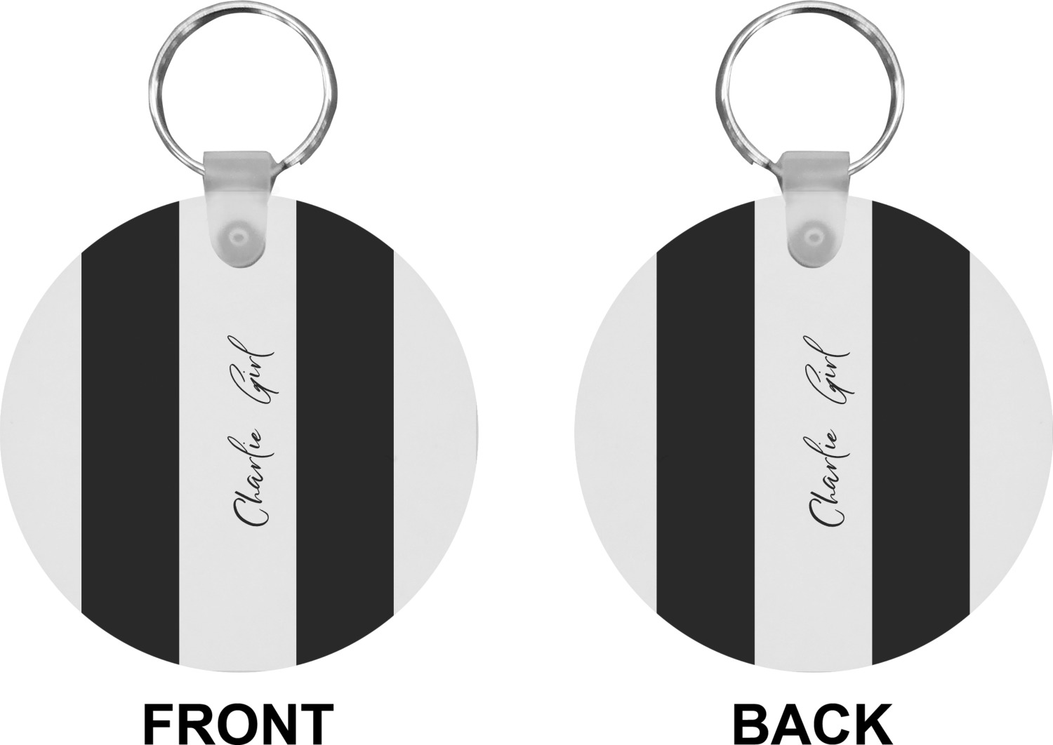 Our personalized keychains attach to the included metal, split key ring with a plastic, removable snap. Since a metal ring is included with your purchase, you have the liberty to keep your keys together on the ring, with or without your unique keychain. We offer this keychain in three different shapes: circle, heart, or diamond. We print your personalized design(s) on both sides of the key chain, and the surface has a glossy, reflective finish that only emphasizes your design. Each keychain is approximately 2.25 by 2.25 inches.