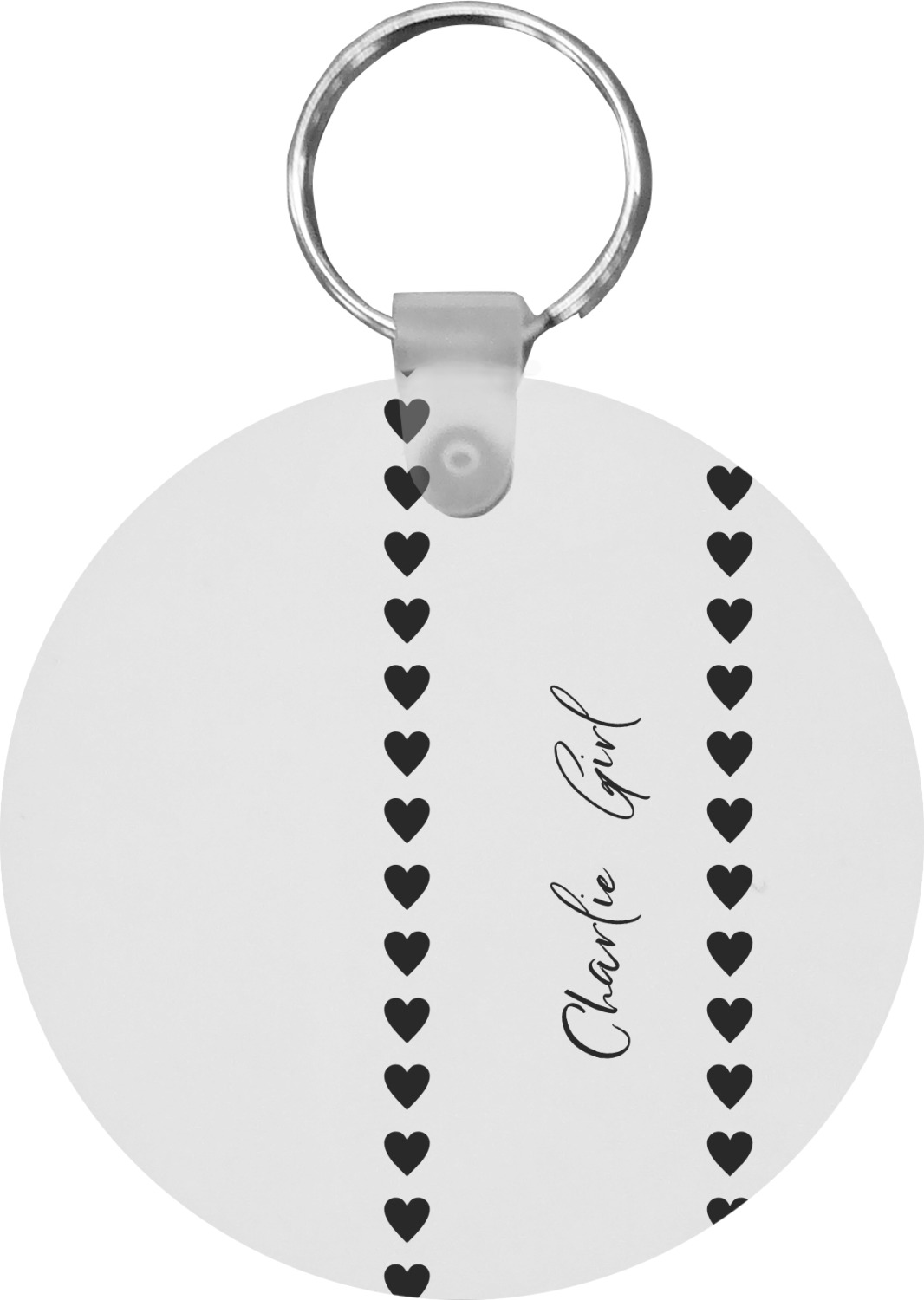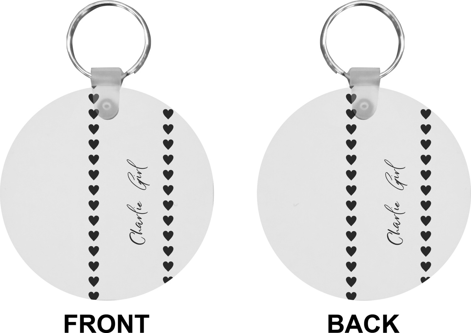 Our personalized keychains attach to the included metal, split key ring with a plastic, removable snap. Since a metal ring is included with your purchase, you have the liberty to keep your keys together on the ring, with or without your unique keychain. We offer this keychain in three different shapes: circle, heart, or diamond. We print your personalized design(s) on both sides of the key chain, and the surface has a glossy, reflective finish that only emphasizes your design. Each keychain is approximately 2.25 by 2.25 inches.