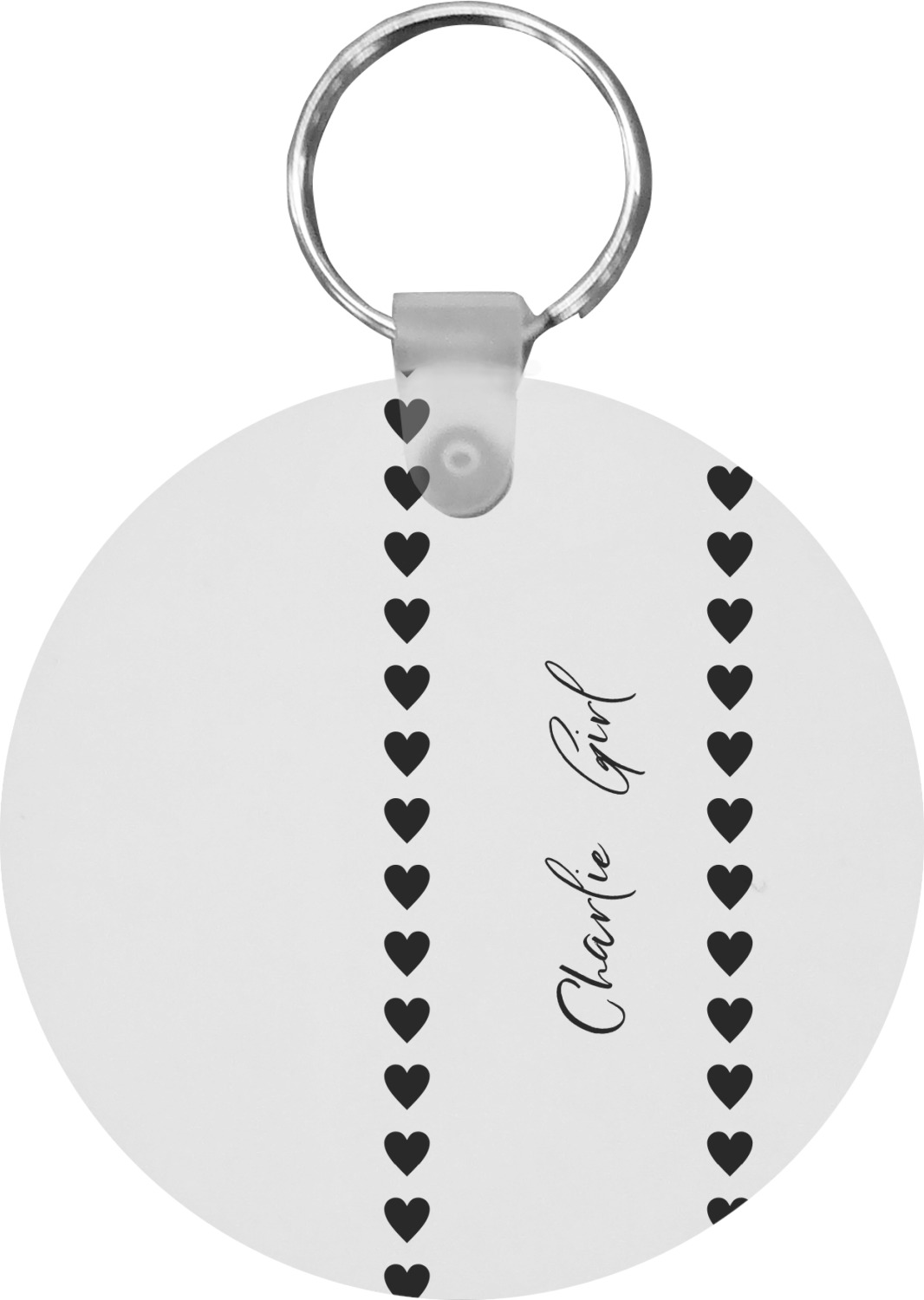 Our personalized keychains attach to the included metal, split key ring with a plastic, removable snap. Since a metal ring is included with your purchase, you have the liberty to keep your keys together on the ring, with or without your unique keychain. We offer this keychain in three different shapes: circle, heart, or diamond. We print your personalized design(s) on both sides of the key chain, and the surface has a glossy, reflective finish that only emphasizes your design. Each keychain is approximately 2.25 by 2.25 inches.