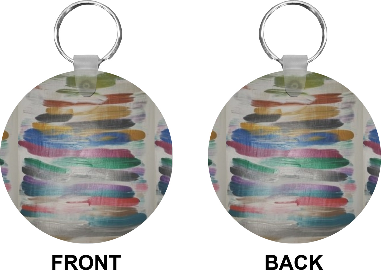Our personalized keychains attach to the included metal, split key ring with a plastic, removable snap. Since a metal ring is included with your purchase, you have the liberty to keep your keys together on the ring, with or without your unique keychain. We offer this keychain in three different shapes: circle, heart, or diamond. We print your personalized design(s) on both sides of the key chain, and the surface has a glossy, reflective finish that only emphasizes your design. Each keychain is approximately 2.25 by 2.25 inches.