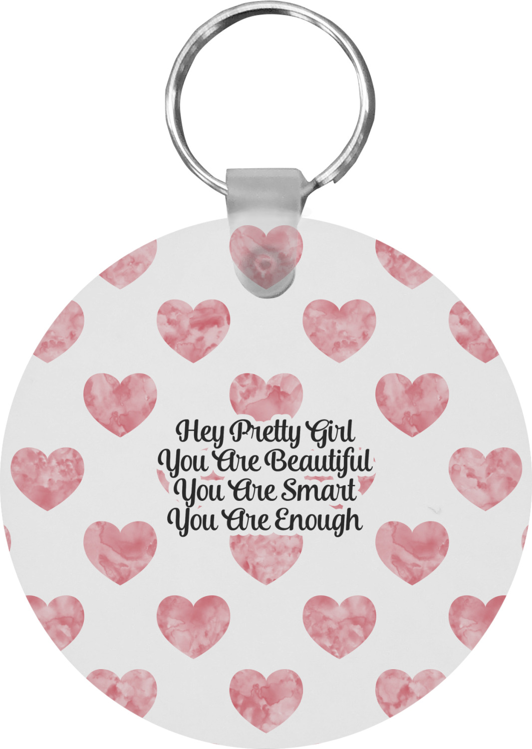 Our personalized keychains attach to the included metal, split key ring with a plastic, removable snap. Since a metal ring is included with your purchase, you have the liberty to keep your keys together on the ring, with or without your unique keychain. We offer this keychain in three different shapes: circle, heart, or diamond. We print your personalized design(s) on both sides of the key chain, and the surface has a glossy, reflective finish that only emphasizes your design. Each keychain is approximately 2.25 by 2.25 inches.