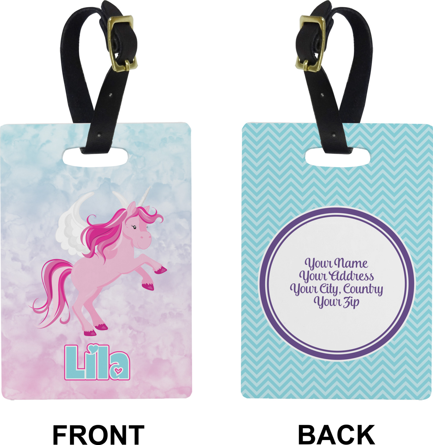 These cute luggage tags are made of a fiber-reinforced, UV-resistant plastic, making them waterproof and durable enough for both everyday use and the rugged adventures of any traveler! A leather strap with holes and a buckle is included with your purchase and can be used to attach your custom luggage tag to any suitcase, backpack, or duffel bag. You can design these travel tags as you wish; your customization will be displayed across the front, while the back will show as little or as much personal information as you want.