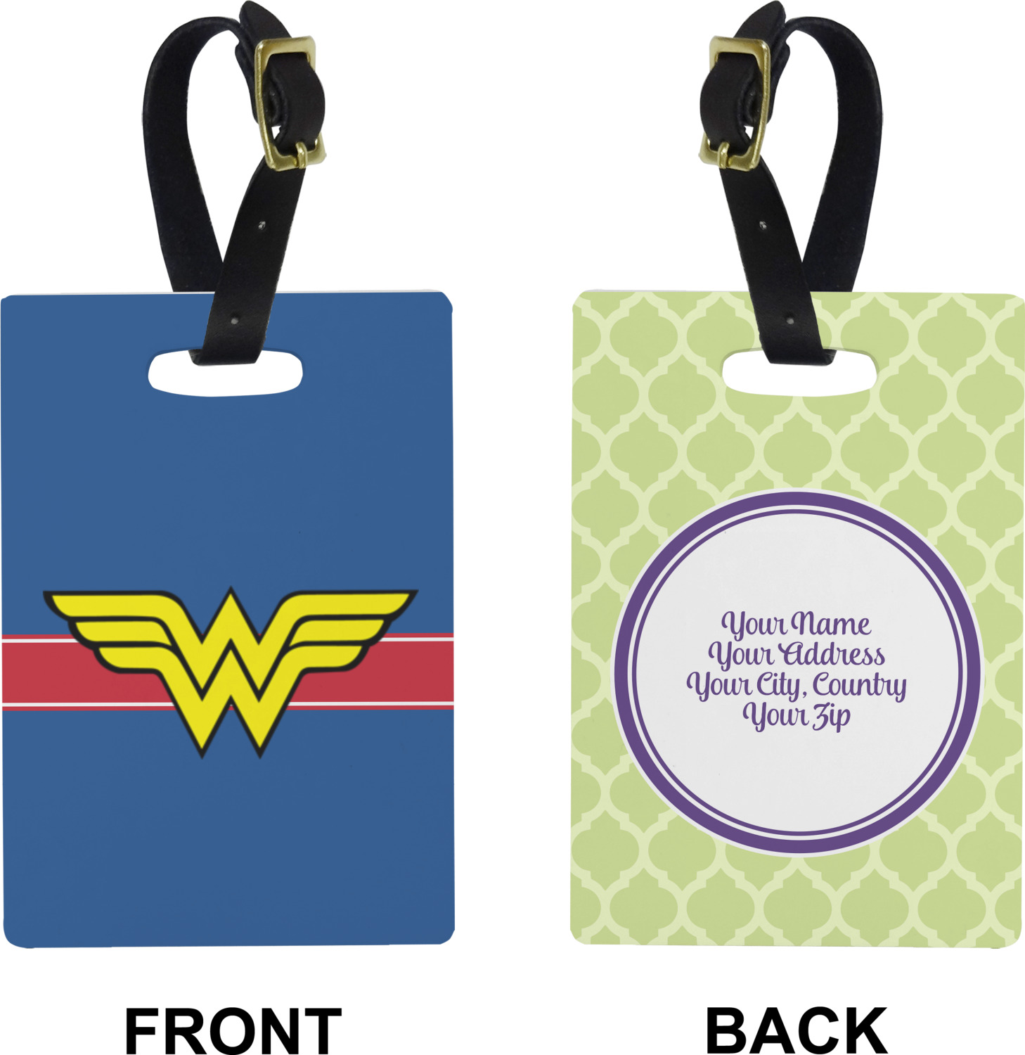 These cute luggage tags are made of a fiber-reinforced, UV-resistant plastic, making them waterproof and durable enough for both everyday use and the rugged adventures of any traveler! A leather strap with holes and a buckle is included with your purchase and can be used to attach your custom luggage tag to any suitcase, backpack, or duffel bag. You can design these travel tags as you wish; your customization will be displayed across the front, while the back will show as little or as much personal information as you want.