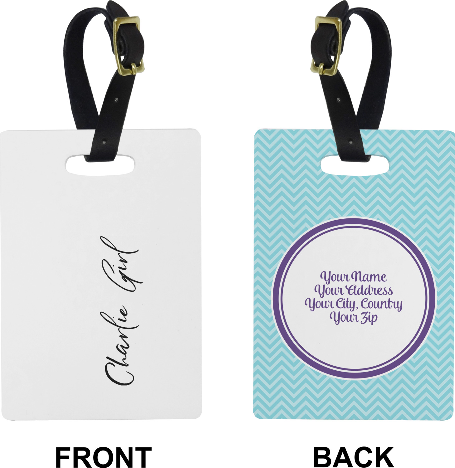 These cute luggage tags are made of a fiber-reinforced, UV-resistant plastic, making them waterproof and durable enough for both everyday use and the rugged adventures of any traveler! A leather strap with holes and a buckle is included with your purchase and can be used to attach your custom luggage tag to any suitcase, backpack, or duffel bag. You can design these travel tags as you wish; your customization will be displayed across the front, while the back will show as little or as much personal information as you want.