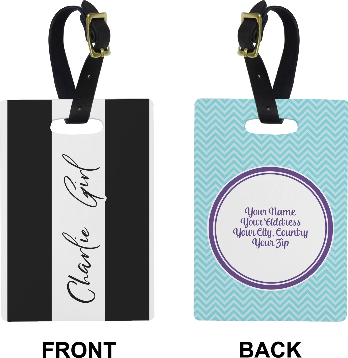 These cute luggage tags are made of a fiber-reinforced, UV-resistant plastic, making them waterproof and durable enough for both everyday use and the rugged adventures of any traveler! A leather strap with holes and a buckle is included with your purchase and can be used to attach your custom luggage tag to any suitcase, backpack, or duffel bag. You can design these travel tags as you wish; your customization will be displayed across the front, while the back will show as little or as much personal information as you want.