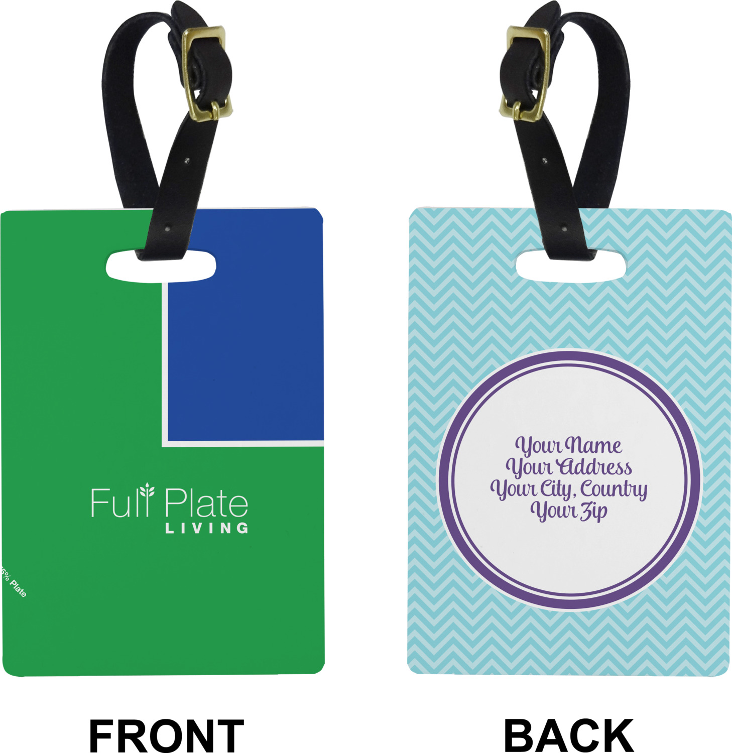 These personalized bag tags are sold in a variety of shapes, so that you may find the product that meets your vision exactly. We sell a round luggage tag, which measures at approximately 4" x 4". Our square luggage tag is about 3.5" x 3.5", while our rectangular version is 2.75" x 4 ".