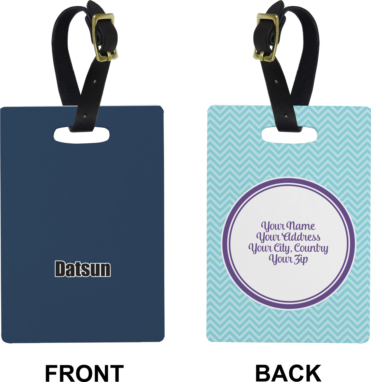These cute luggage tags are made of a fiber-reinforced, UV-resistant plastic, making them waterproof and durable enough for both everyday use and the rugged adventures of any traveler! A leather strap with holes and a buckle is included with your purchase and can be used to attach your custom luggage tag to any suitcase, backpack, or duffel bag. You can design these travel tags as you wish; your customization will be displayed across the front, while the back will show as little or as much personal information as you want.