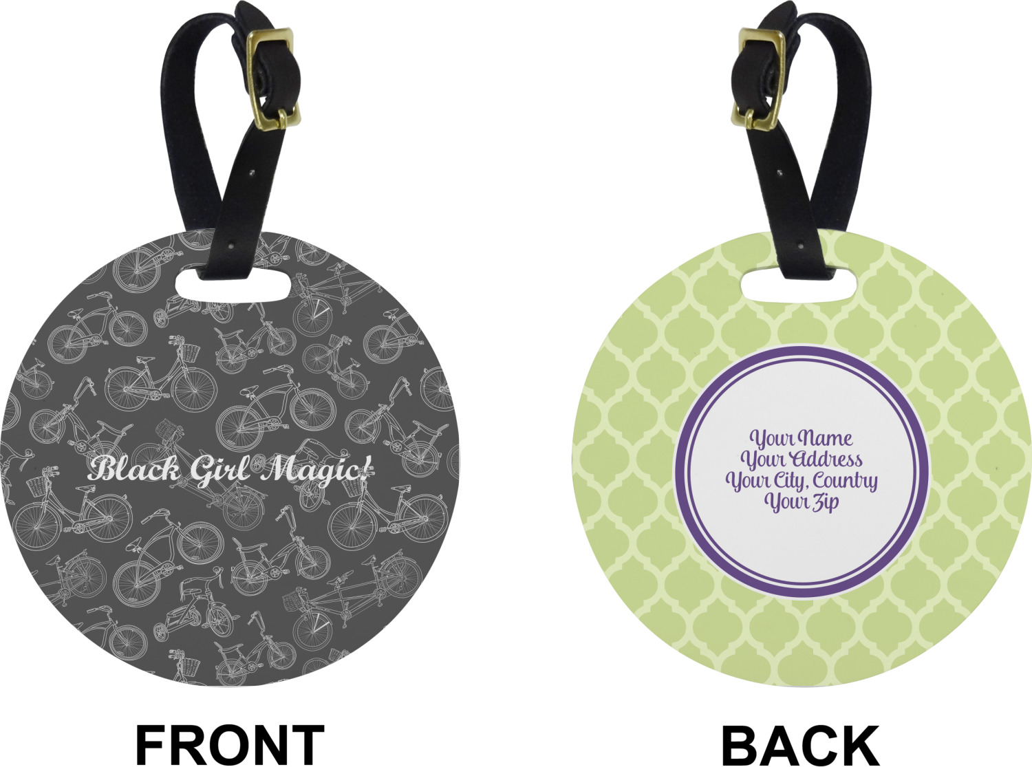 These cute luggage tags are made of a fiber-reinforced, UV-resistant plastic, making them waterproof and durable enough for both everyday use and the rugged adventures of any traveler! A leather strap with holes and a buckle is included with your purchase and can be used to attach your custom luggage tag to any suitcase, backpack, or duffel bag. You can design these travel tags as you wish; your customization will be displayed across the front, while the back will show as little or as much personal information as you want.