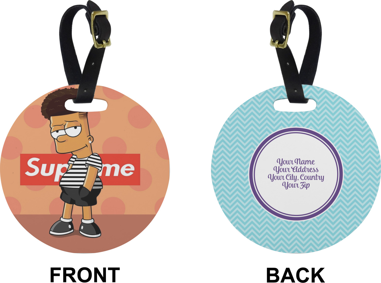 These cute luggage tags are made of a fiber-reinforced, UV-resistant plastic, making them waterproof and durable enough for both everyday use and the rugged adventures of any traveler! A leather strap with holes and a buckle is included with your purchase and can be used to attach your custom luggage tag to any suitcase, backpack, or duffel bag. You can design these travel tags as you wish; your customization will be displayed across the front, while the back will show as little or as much personal information as you want.