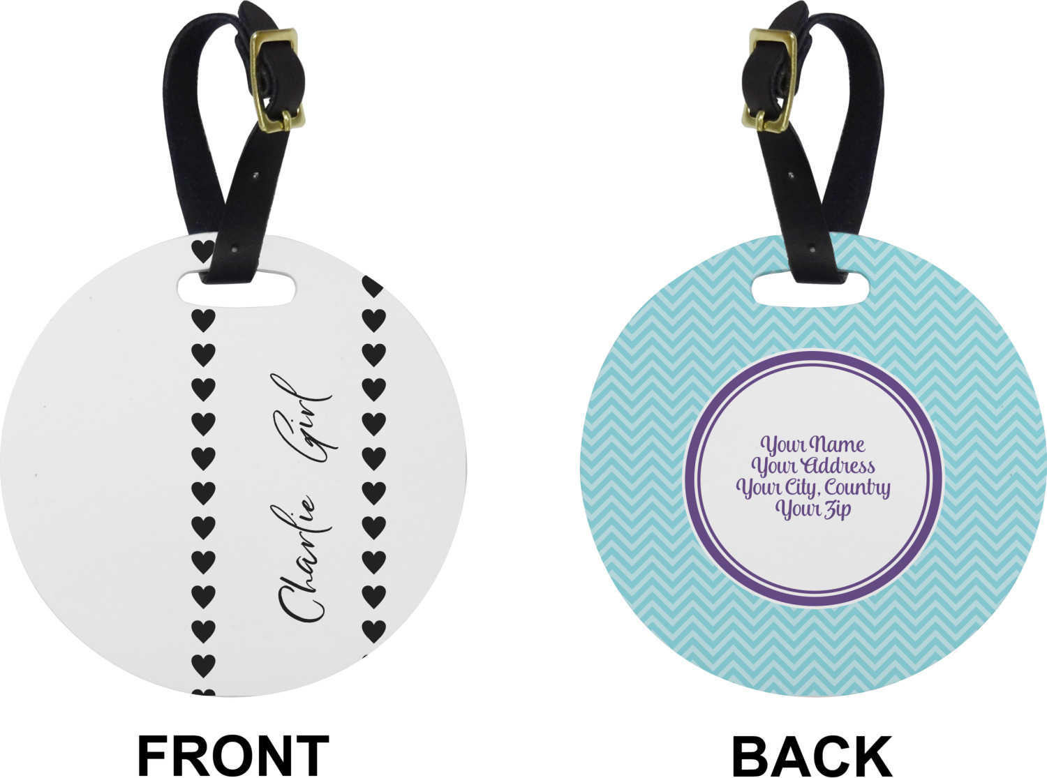 These personalized bag tags are sold in a variety of shapes, so that you may find the product that meets your vision exactly. We sell a round luggage tag, which measures at approximately 4" x 4". Our square luggage tag is about 3.5" x 3.5", while our rectangular version is 2.75" x 4 ".