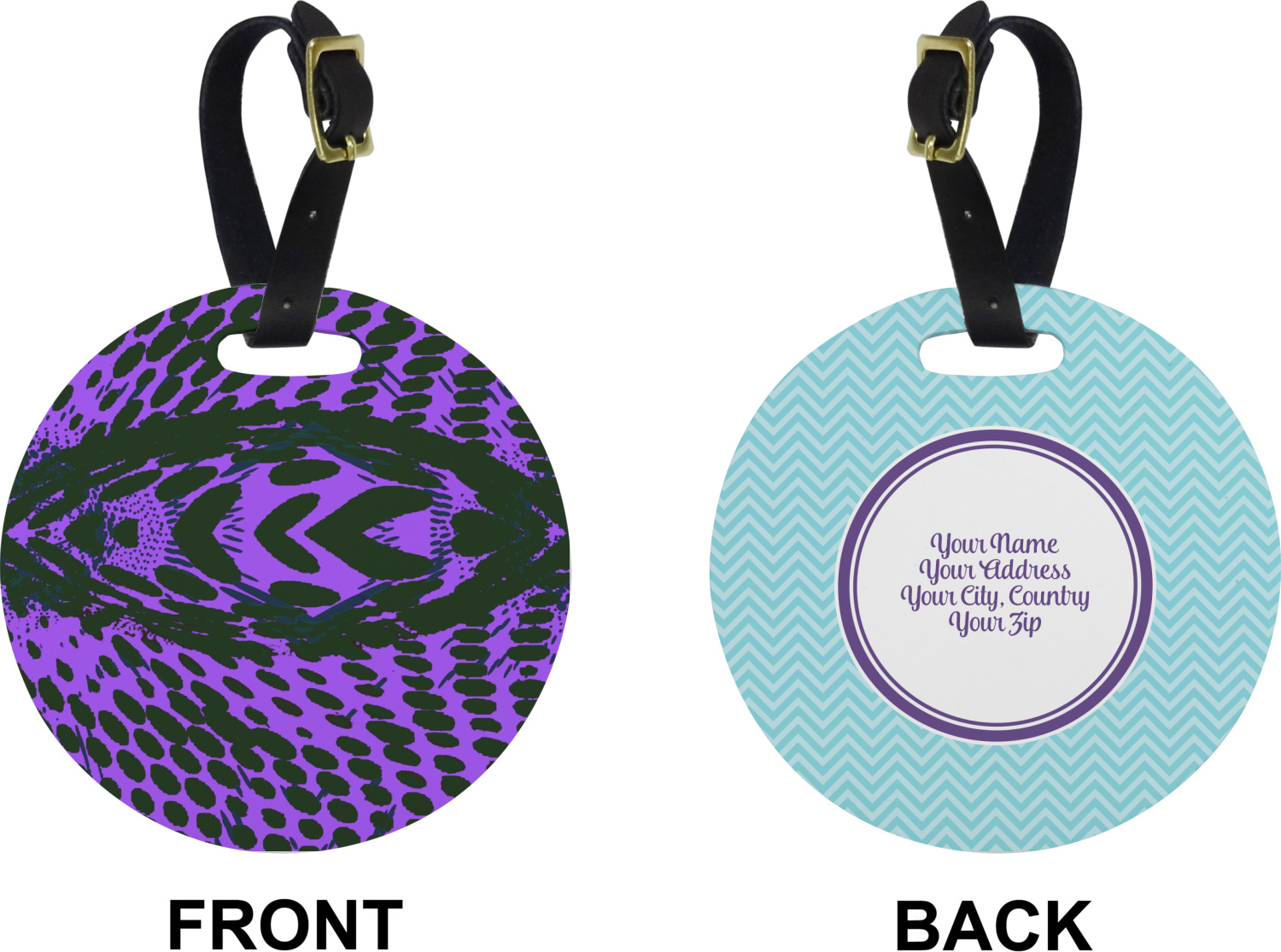 These personalized bag tags are sold in a variety of shapes, so that you may find the product that meets your vision exactly. We sell a round luggage tag, which measures at approximately 4" x 4". Our square luggage tag is about 3.5" x 3.5", while our rectangular version is 2.75" x 4 ".