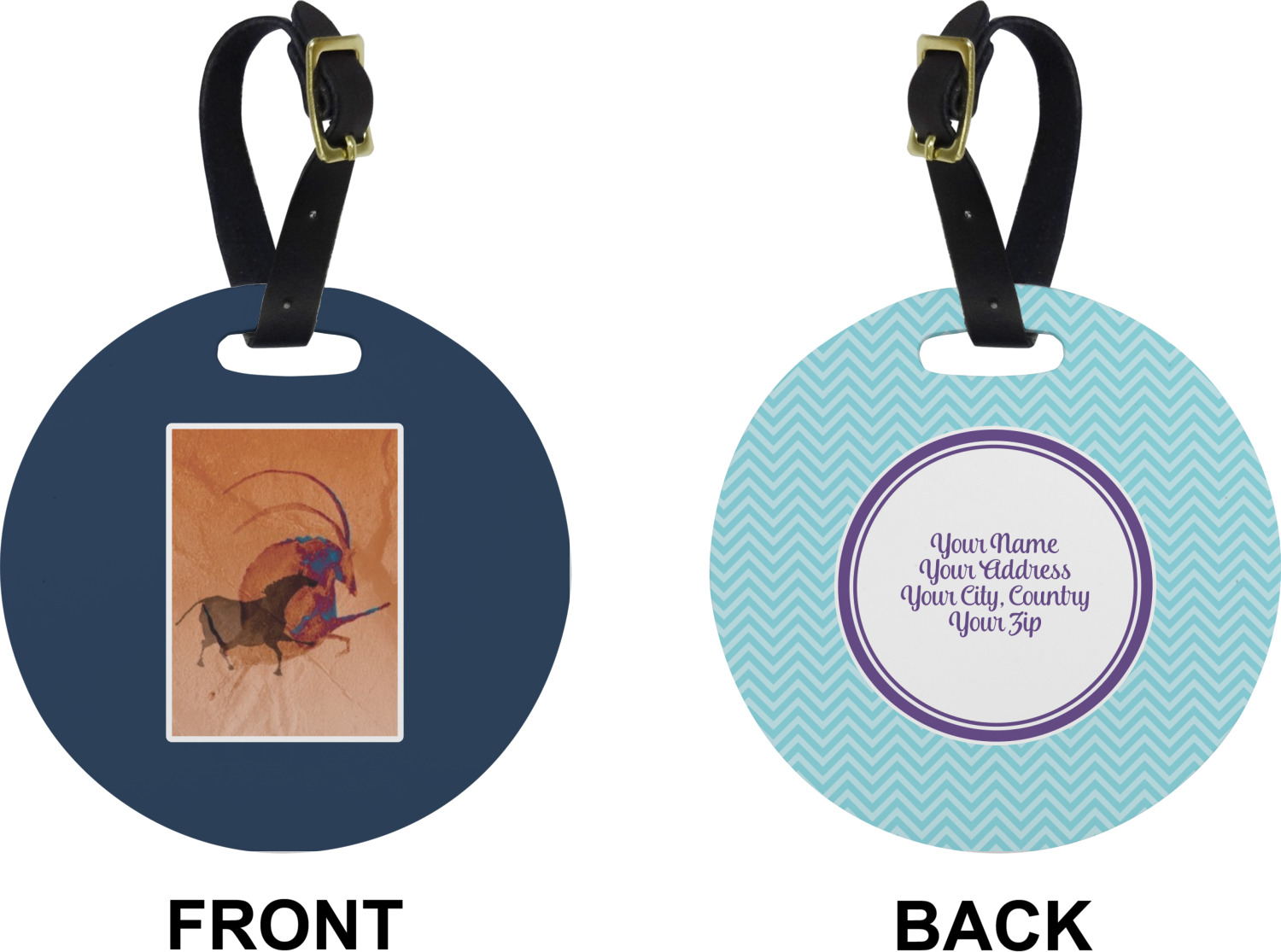These cute luggage tags are made of a fiber-reinforced, UV-resistant plastic, making them waterproof and durable enough for both everyday use and the rugged adventures of any traveler! A leather strap with holes and a buckle is included with your purchase and can be used to attach your custom luggage tag to any suitcase, backpack, or duffel bag. You can design these travel tags as you wish; your customization will be displayed across the front, while the back will show as little or as much personal information as you want.