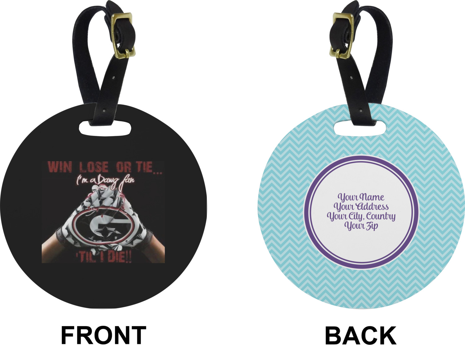 These cute luggage tags are made of a fiber-reinforced, UV-resistant plastic, making them waterproof and durable enough for both everyday use and the rugged adventures of any traveler! A leather strap with holes and a buckle is included with your purchase and can be used to attach your custom luggage tag to any suitcase, backpack, or duffel bag. You can design these travel tags as you wish; your customization will be displayed across the front, while the back will show as little or as much personal information as you want.