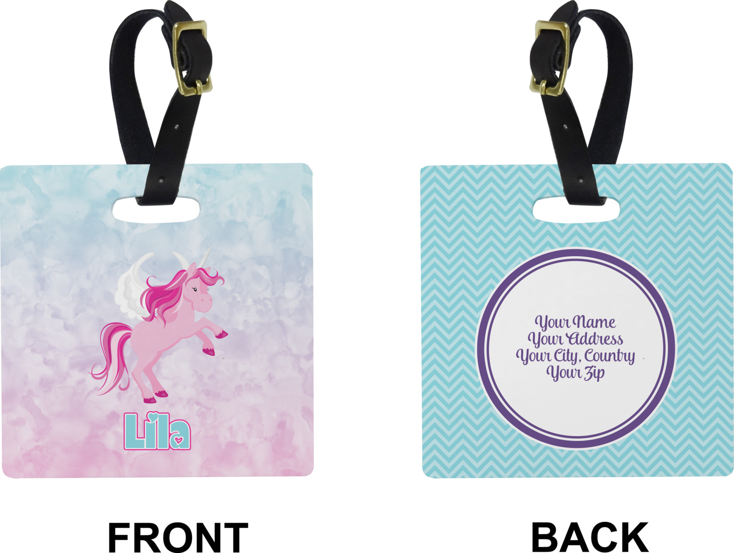 These cute luggage tags are made of a fiber-reinforced, UV-resistant plastic, making them waterproof and durable enough for both everyday use and the rugged adventures of any traveler! A leather strap with holes and a buckle is included with your purchase and can be used to attach your custom luggage tag to any suitcase, backpack, or duffel bag. You can design these travel tags as you wish; your customization will be displayed across the front, while the back will show as little or as much personal information as you want.