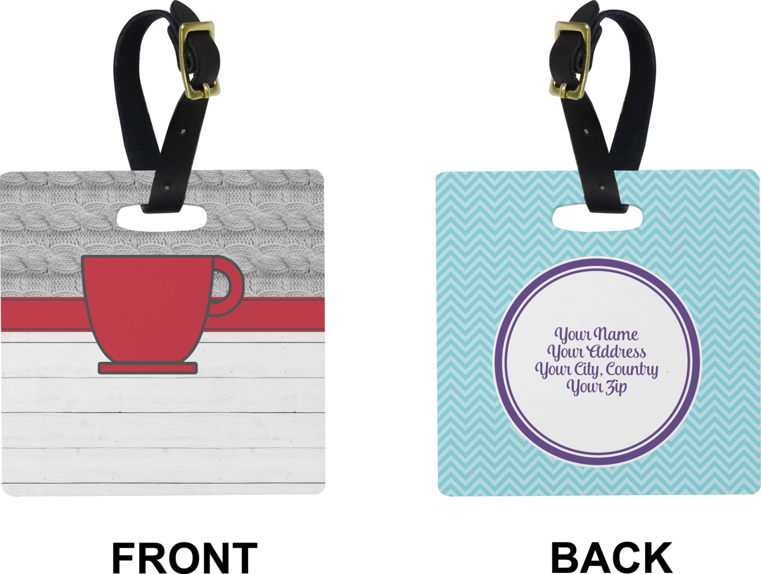 These personalized bag tags are sold in a variety of shapes, so that you may find the product that meets your vision exactly. We sell a round luggage tag, which measures at approximately 4" x 4". Our square luggage tag is about 3.5" x 3.5", while our rectangular version is 2.75" x 4 ".