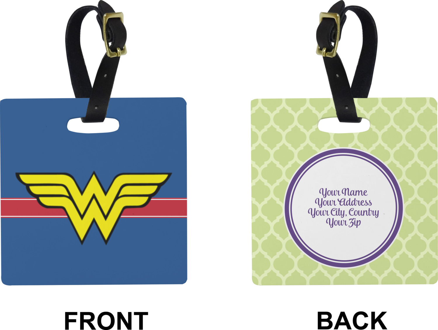These personalized bag tags are sold in a variety of shapes, so that you may find the product that meets your vision exactly. We sell a round luggage tag, which measures at approximately 4" x 4". Our square luggage tag is about 3.5" x 3.5", while our rectangular version is 2.75" x 4 ".