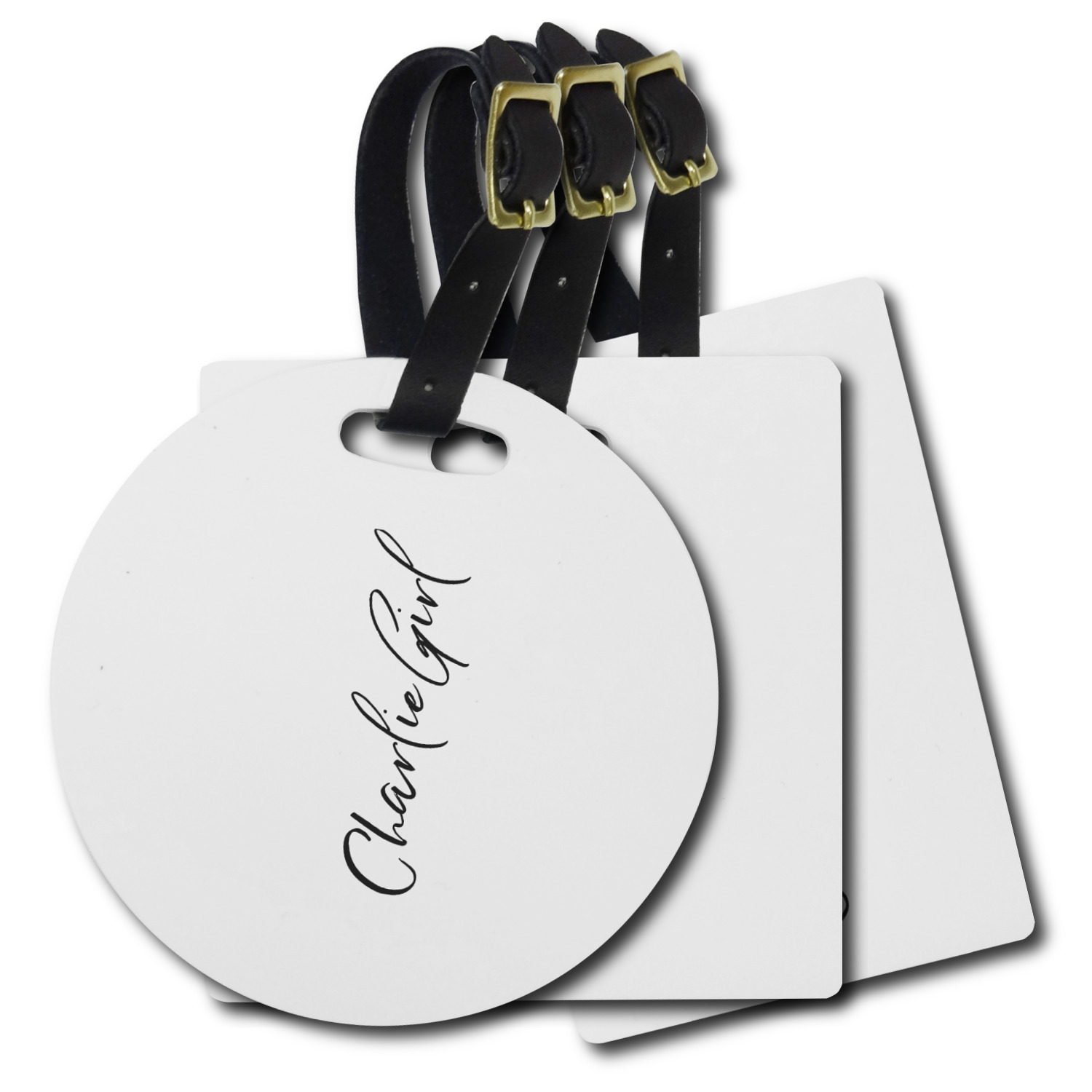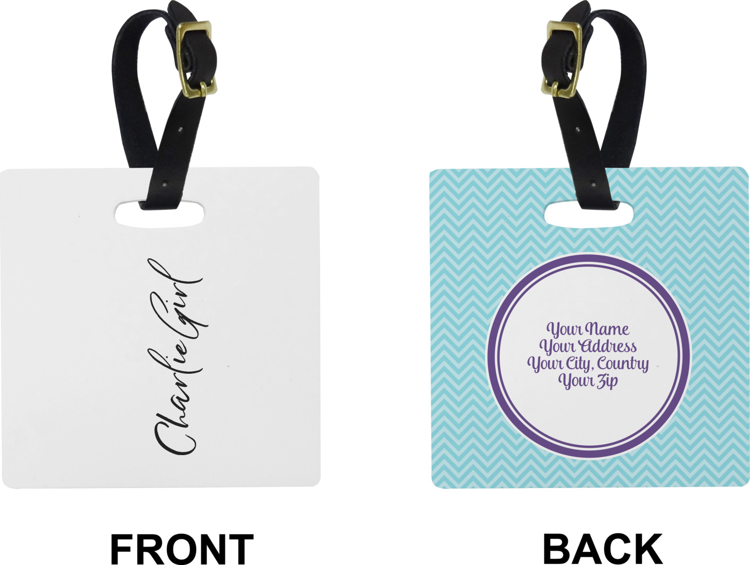 These personalized bag tags are sold in a variety of shapes, so that you may find the product that meets your vision exactly. We sell a round luggage tag, which measures at approximately 4" x 4". Our square luggage tag is about 3.5" x 3.5", while our rectangular version is 2.75" x 4 ".