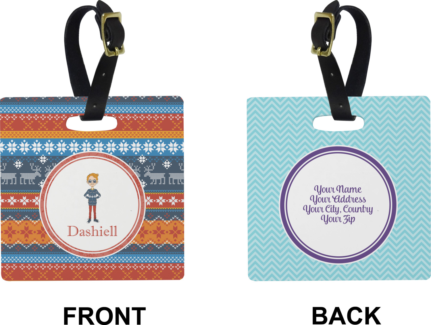 These cute luggage tags are made of a fiber-reinforced, UV-resistant plastic, making them waterproof and durable enough for both everyday use and the rugged adventures of any traveler! A leather strap with holes and a buckle is included with your purchase and can be used to attach your custom luggage tag to any suitcase, backpack, or duffel bag. You can design these travel tags as you wish; your customization will be displayed across the front, while the back will show as little or as much personal information as you want.