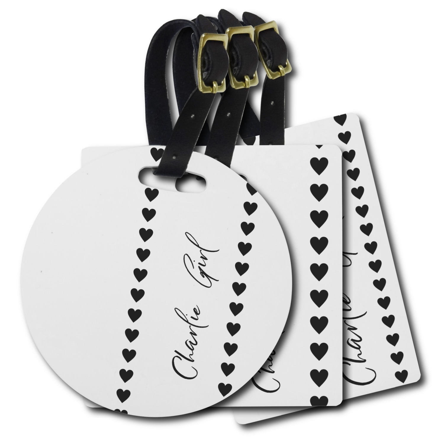 These personalized bag tags are sold in a variety of shapes, so that you may find the product that meets your vision exactly. We sell a round luggage tag, which measures at approximately 4" x 4". Our square luggage tag is about 3.5" x 3.5", while our rectangular version is 2.75" x 4 ".
