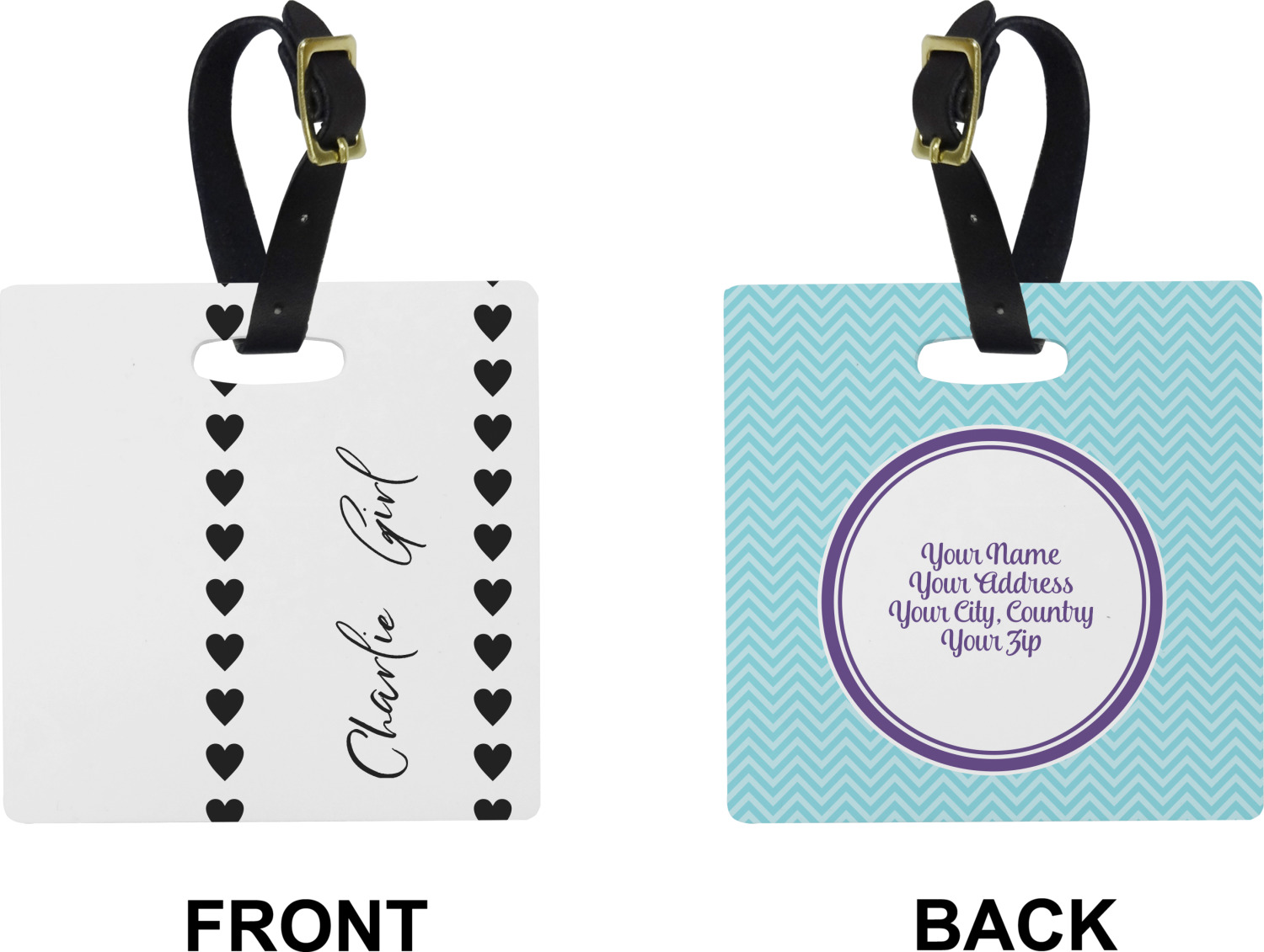 These cute luggage tags are made of a fiber-reinforced, UV-resistant plastic, making them waterproof and durable enough for both everyday use and the rugged adventures of any traveler! A leather strap with holes and a buckle is included with your purchase and can be used to attach your custom luggage tag to any suitcase, backpack, or duffel bag. You can design these travel tags as you wish; your customization will be displayed across the front, while the back will show as little or as much personal information as you want.