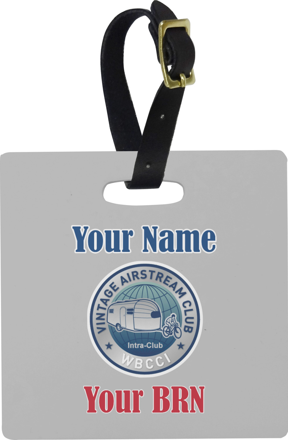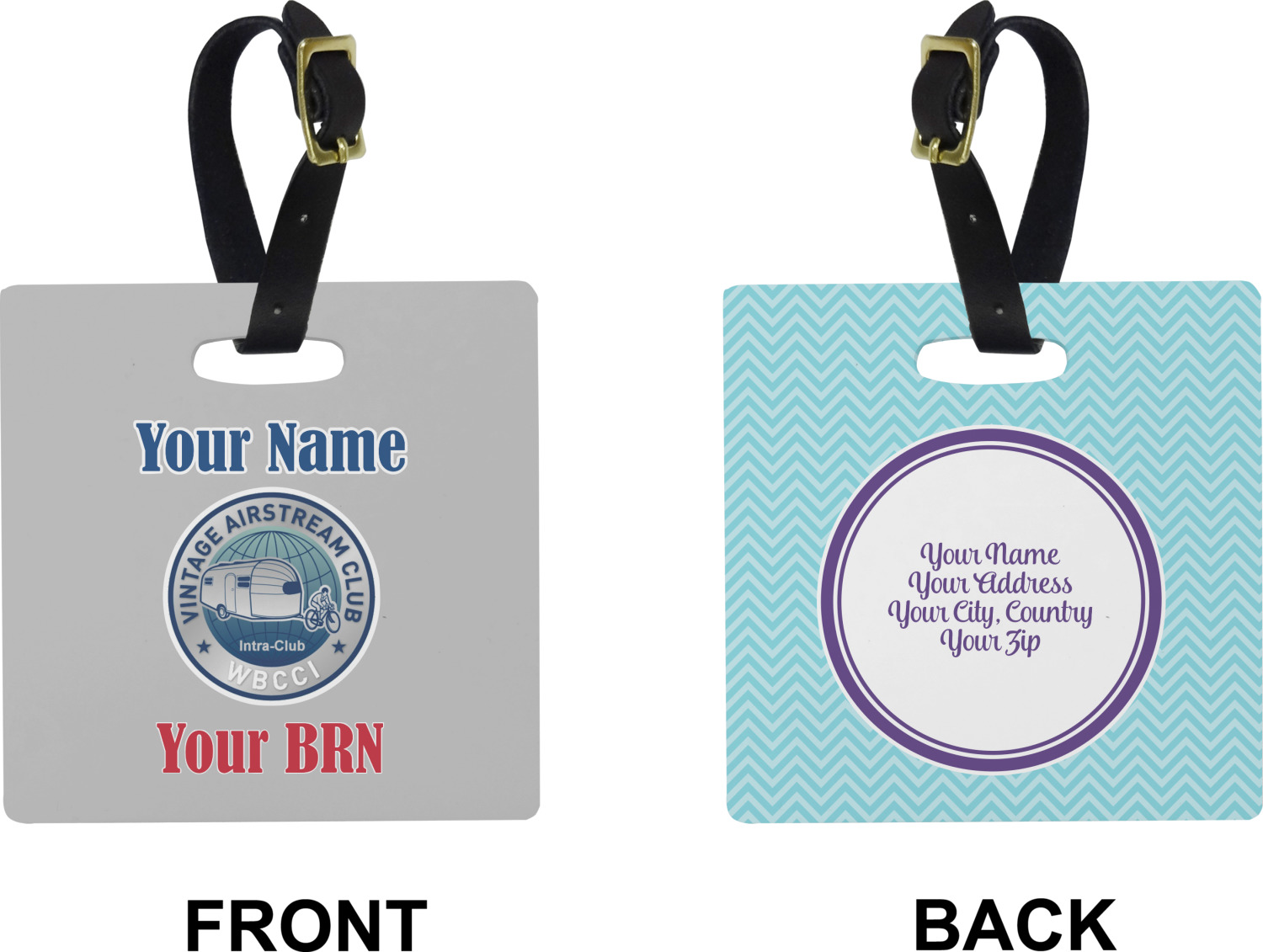 These personalized bag tags are sold in a variety of shapes, so that you may find the product that meets your vision exactly. We sell a round luggage tag, which measures at approximately 4" x 4". Our square luggage tag is about 3.5" x 3.5", while our rectangular version is 2.75" x 4 ".